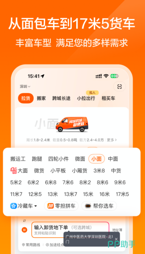 聚焦中大件物品运输与家庭搬迁场景,提供从微型厢货到大型厢式货车的全车型覆盖。用户下单后平均响应时间低于一分钟,可依据货物尺寸、数量及楼层条件,自主选择适配车型;地图实时显示周边可调度运力,支持提前预约用车时段,运力网络覆盖全国主要城市及城区,确保“有单必应、有车必达”。