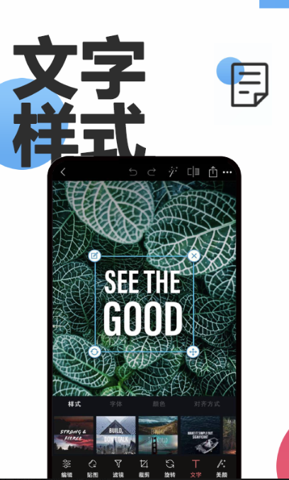 下载这个软件然你在在手机上也能实现精细的图片处理!专业的图片处理工具能够实现的功能这里都可以实现,而且移动端更加人性化和智能的操作也能让你获得更好的尖刺操作体验!不管是抠取部分图片内容还是对图片进行色彩变更和调整都可以在这里轻松实现!便捷的水印工具和摄影后期工具包让你在手机上也能把图片处理得更加高级,此外独家字体素材也能让你的图片具有更强的设计感!