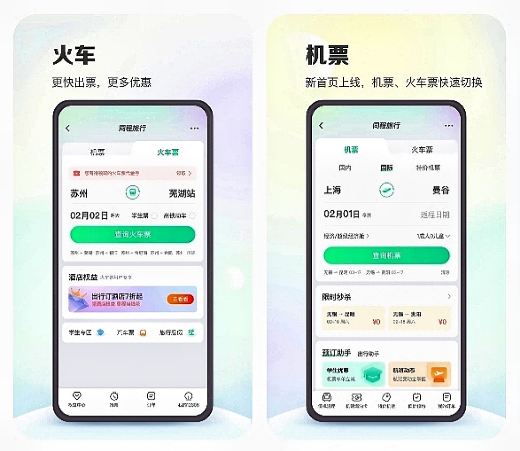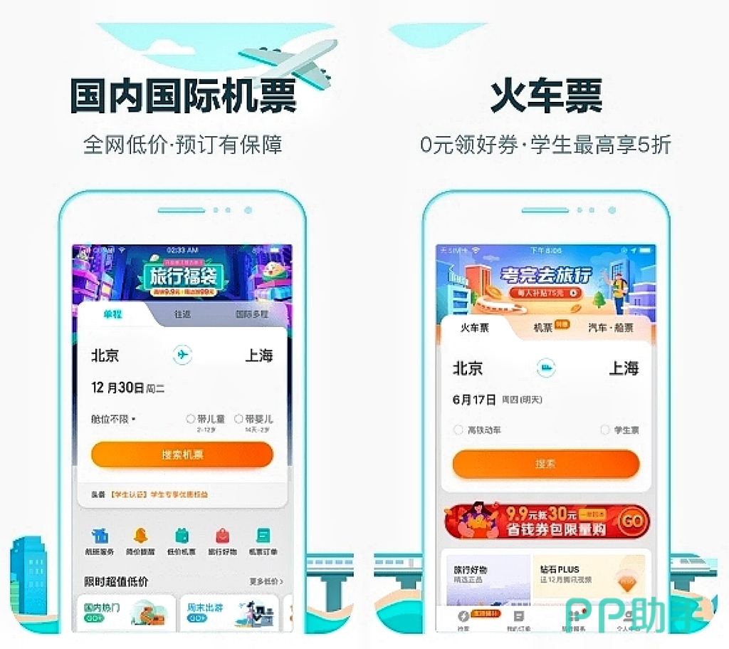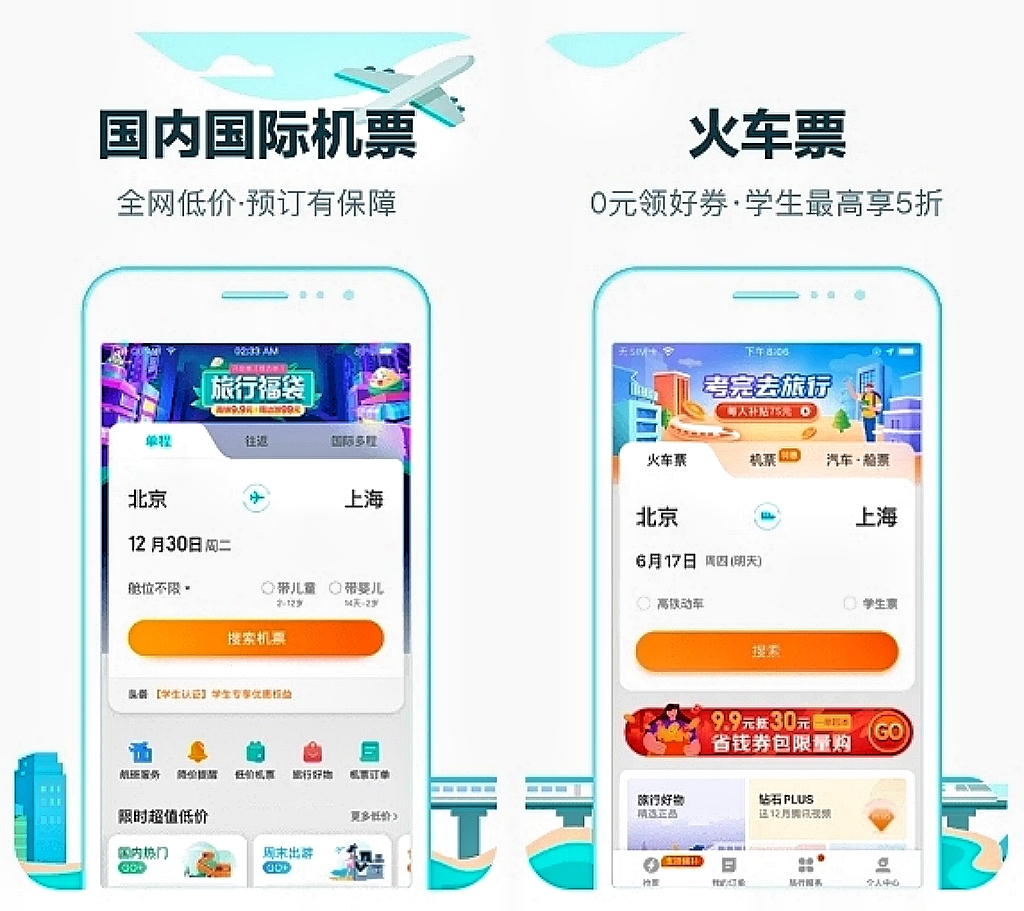 软件在购票和订酒店方面使用十分广泛,国内外都有服务,出门可以随时订火车票、船票和机票,学生还享有打折优惠。如果要出去玩,还可以在线上购买景点门票,海洋馆、欢乐谷、动物园,想去哪里玩就去哪里玩。