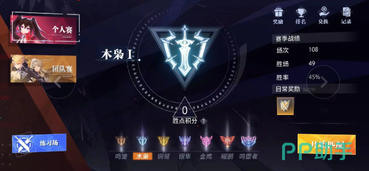 PVP这个模式被称为排位赛,其中这个模式可以分为个人赛以及团队赛,这个赛季分别有7个段位,名称也各不相同,分别为鸣雏,木枭、铜鹫、银隼、金鹰、曜鹏以及鸣雷者,一次按照顺序来晋升,其中鸣雏是最低段位,鸣雷者是最高段位。