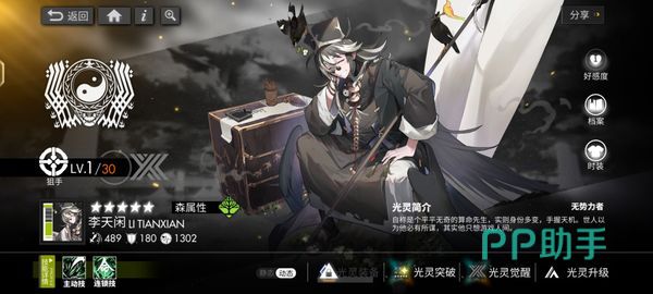 李天闲是一个五星森属性的角色,在游戏中的定位是狙击手,他的形象非常的好看,是一个算命先生,在游戏中可以直接对指定敌人造成高额伤害,并且还拥有范围攻击的效果,到达指定格子之后可以直接对该范围的敌人造成一定的伤害效果。