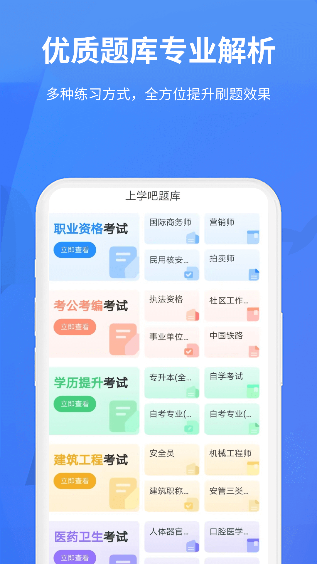 上学吧题库APP汇集了大量试题资源,涵盖了各种类型的考试,可以帮助你练习各种试题,提高考试复习的效率。