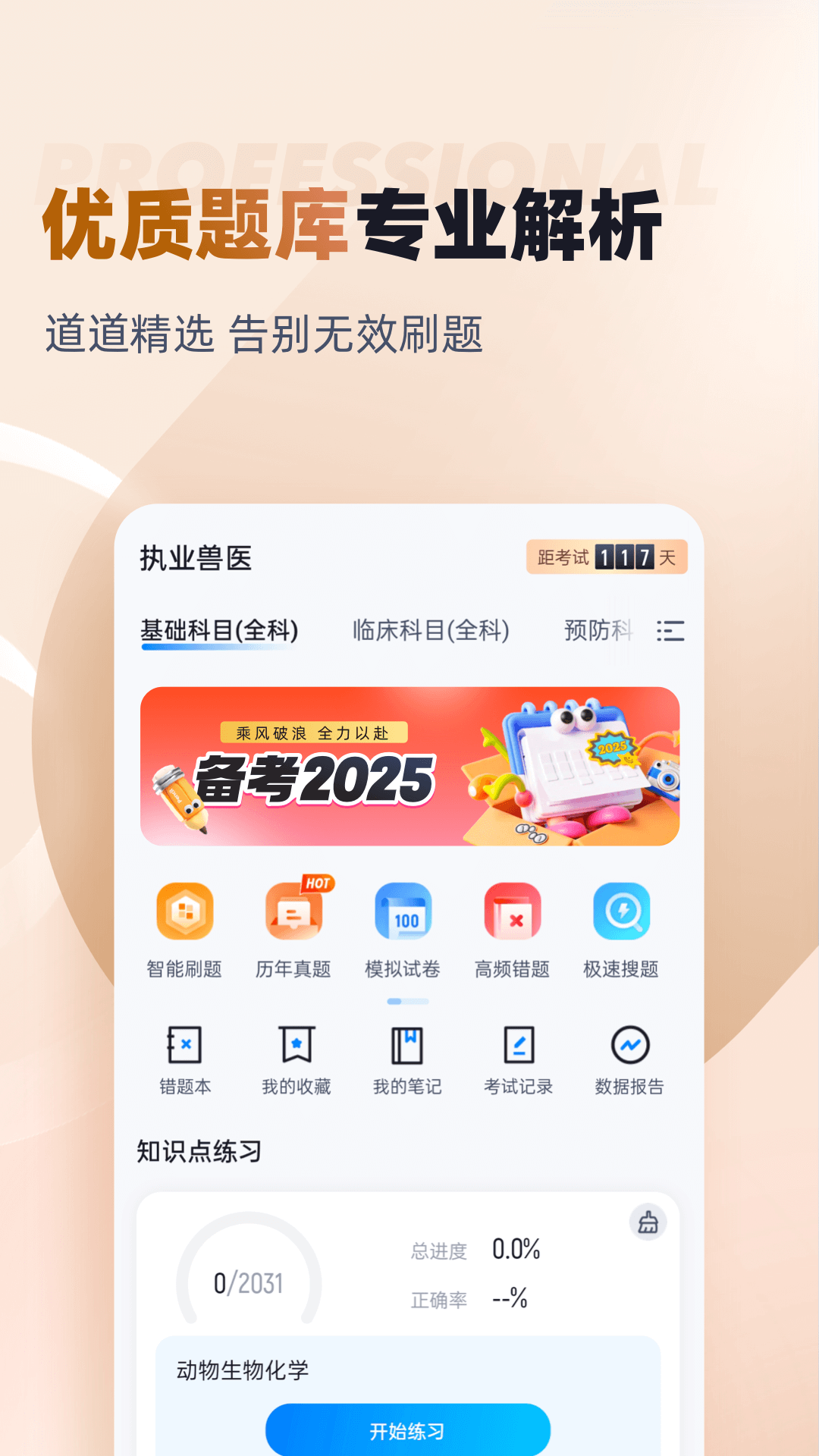 执业兽医题库内含考点练习,全国通用卷以及地区卷模拟练习,以及按照固定考试比重的随机式的抽题的真题考场,成绩单实时记录考试数据,一点一滴的反馈考生近期学习状态以及自我正确率的提升,大大的给予考生通过考试的信心。