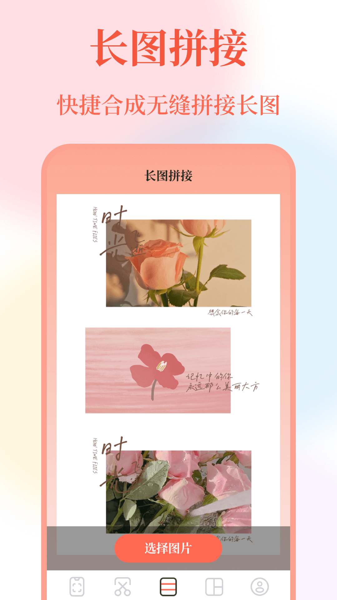 3. 无缝拼图 ——简约而不简单的无缝拼图,有你爱不释手的各种经典照片排版,也有你满心期待的花式创意排版,轻轻松松衔接你的照片图集,简简单单合成你的专属图片秀、