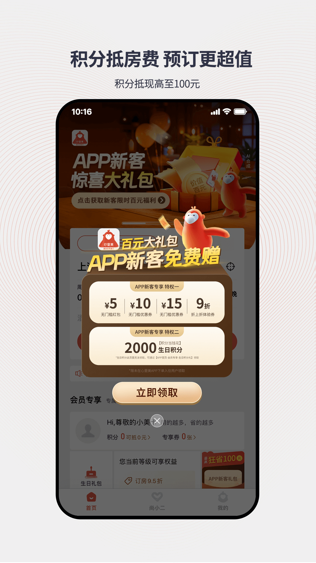 作为会员积分最多的酒店预订平台,心里美会员积分可直接当钱花,让您的预订更超值。每消费1元累积1积分,积分直抵房费,最高抵扣100元/单。为您带来经济实惠的同时,更不失高品质的旅宿体验。