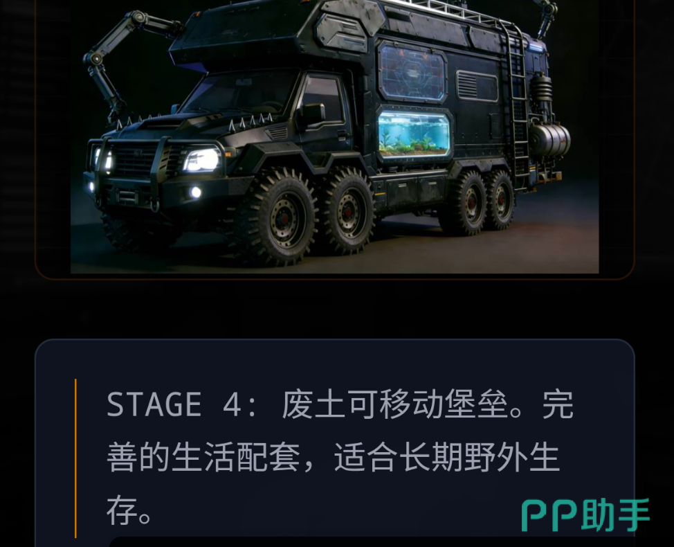 车辆改造系统是本作的核心特色之一。初始载具为一辆基础皮卡,玩家可通过多阶段升级将其重塑为具备完整生存功能的移动堡垒:加装冲撞前杠强化近战防御,铺设太阳能发电阵列实现能源自持,搭建水培种植舱完成食物闭环供给。这一过程不仅考验策略规划能力,更强调空间结构理解与创意解决方案的应用。