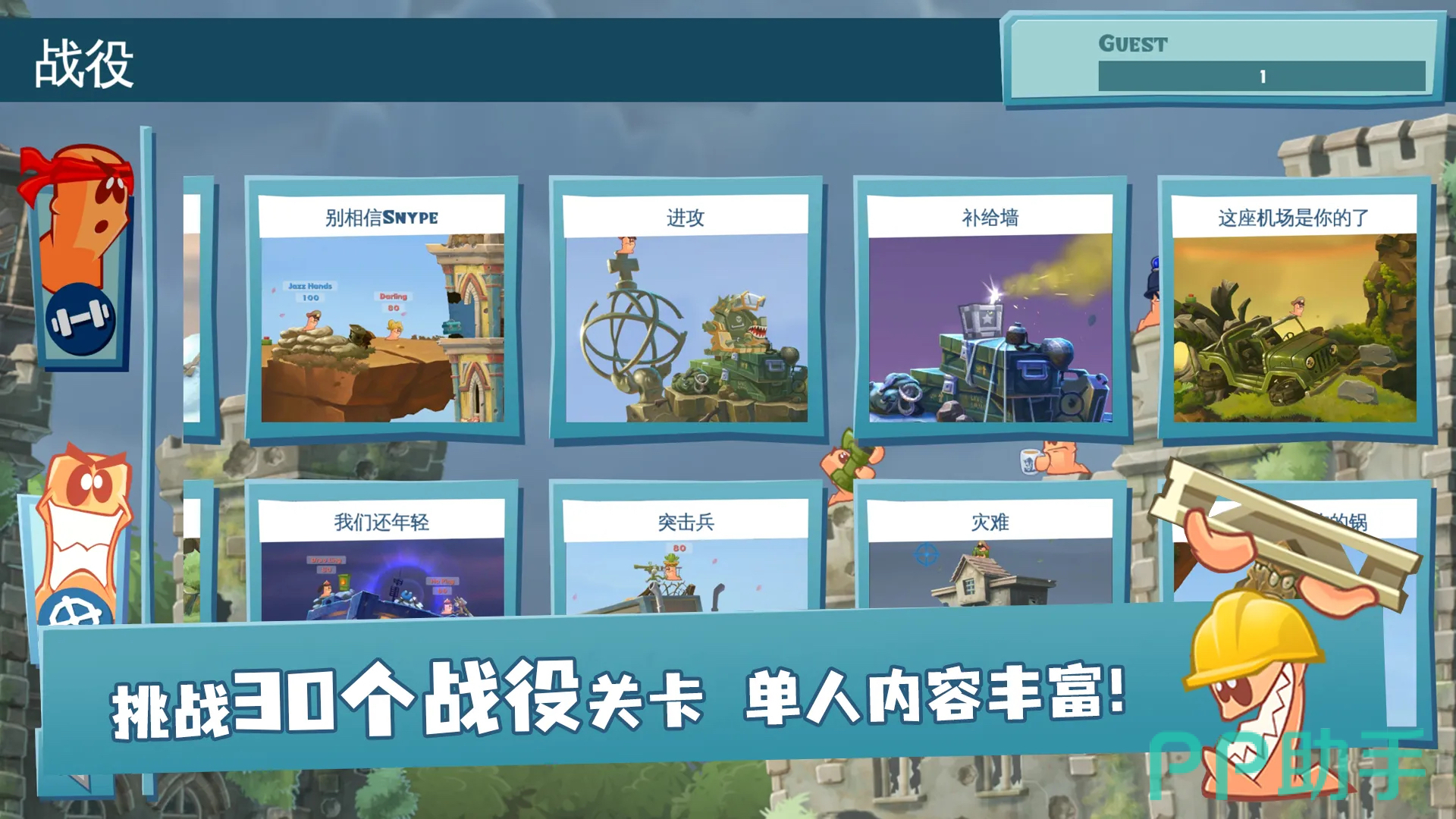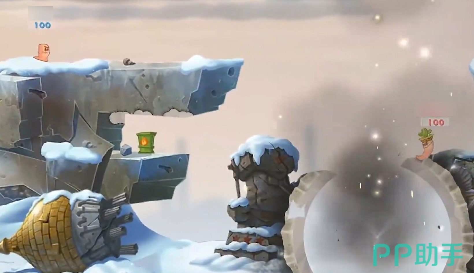 玩法层面延续了系列标志性回合制战术对抗体系,主打“闯关模式”。地图设计强调差异化,涵盖火山裂隙、冰面浮岛、机械工坊等多种地貌,每张地图均嵌入动态机关与环境陷阱。玩家需结合地形特征、武器射程、风向参数及角色行动点数进行策略部署,实现精准打击与战术规避。