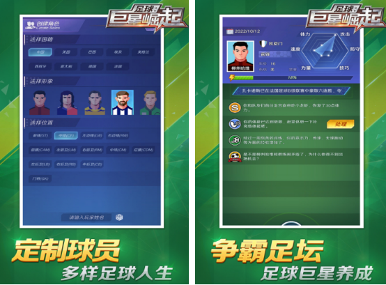 本作以青春成长叙事为主线,玩家将扮演一名15岁的新人球员,在职业俱乐部青训体系中开启职业生涯。初始能力有限,需通过日常训练、队内对抗及正式赛事不断积累实战经验,逐步提升技术、意识与心理素质。区别于硬核操作导向,游戏强调策略判断、临场决策与长期养成逻辑,让每位玩家都能走出属于自己的巨星之路。