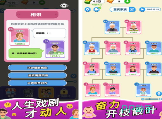开局即掌握家族命运主导权,从30个差异化初始角色中择一立身,通过婚配选择、职业发展与突发事件应对,构建专属人生轨迹。美术风格明快清新,系统深度扎实:涵盖数十种现实向职业路径,同步嵌入情感纠纷、社会压力、经济波动等动态事件,考验玩家在多重变量下的决策能力与长期规划意识。