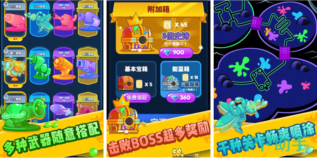 该游戏以抽象涂鸦美学贯穿全局,将传统塔防中的“路径”转化为可自由绘制的动态轨迹线,玩家可通过手势实时调整防御节点分布。武器库涵盖激光束、酸液池、引力场等十余类机制迥异的装置,BOSS战设有阶段转换机制与环境互动要素;关卡内置“速通模式”与“生存挑战”双进度树,满足不同目标导向型玩家需求。