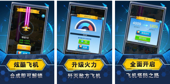 首创空战+地面防御双轨并行机制,玩家既可操控战机执行空中打击任务,也可部署防空炮台构建立体防御网。战机支持模块化改装,引擎、武器挂载、装甲板三类组件独立升级;塔防部分引入“弹道预判系统”,高级炮台可标记敌人移动轨迹并提前布设拦截点;辅助道具包含电磁脉冲、时间缓速等强功能性技能,显著提升极限关卡容错率。