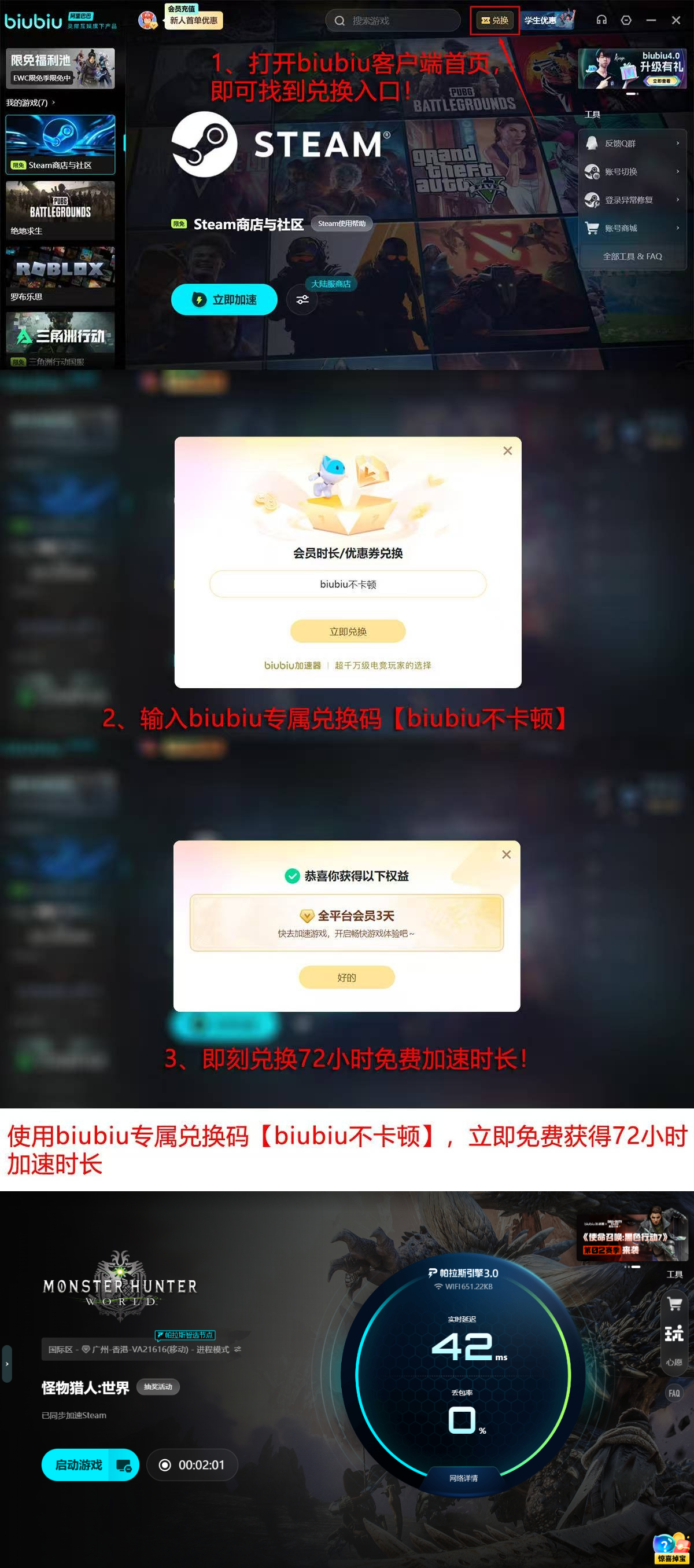 立即注册biubiu加速器,解锁两项新人专属权益:完成注册即获24小时全功能免费试用权限;输入激活码【biubiu不卡顿】还可额外领取72小时加速时长。两项叠加,新用户总计可享96小时高品质加速服务,切实缓解因网络波动导致的闪退问题。