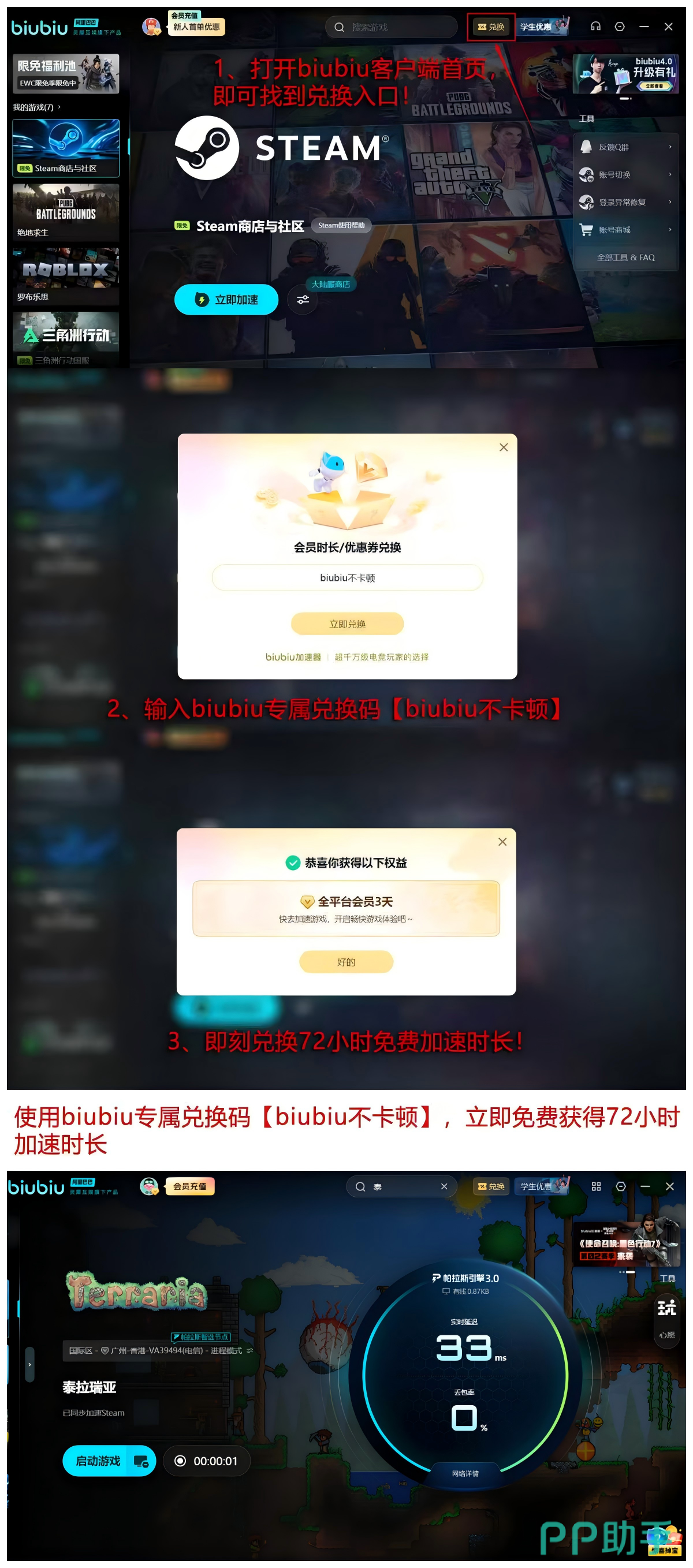 输入口令【biubiu不卡顿】即可领取72小时全节点加速权益,新用户额外叠加24小时专属时长,总计享96小时免费加速服务。后台常驻模式支持静默优化,全程不干扰游戏操作,已获大量玩家实测认可。