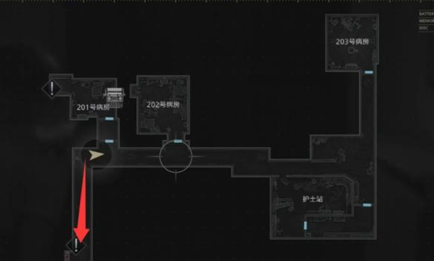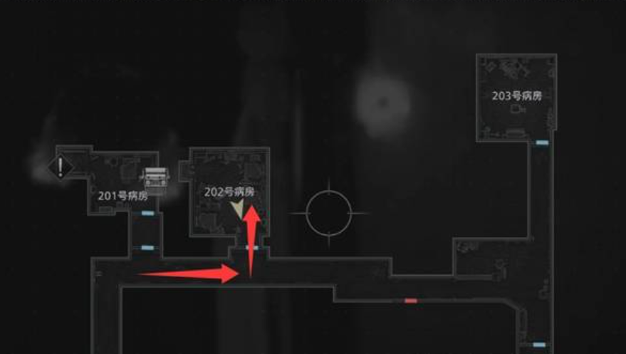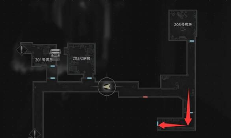 离开203病房后沿西侧走廊直行至尽头,在右侧抽屉内取得【智天使钥匙】。注意走廊南侧房间因电路故障处于断电状态,当前无法进入;同时需留意环境音效变化——脚步声、滴水声或远处低语可能预示怪物临近。