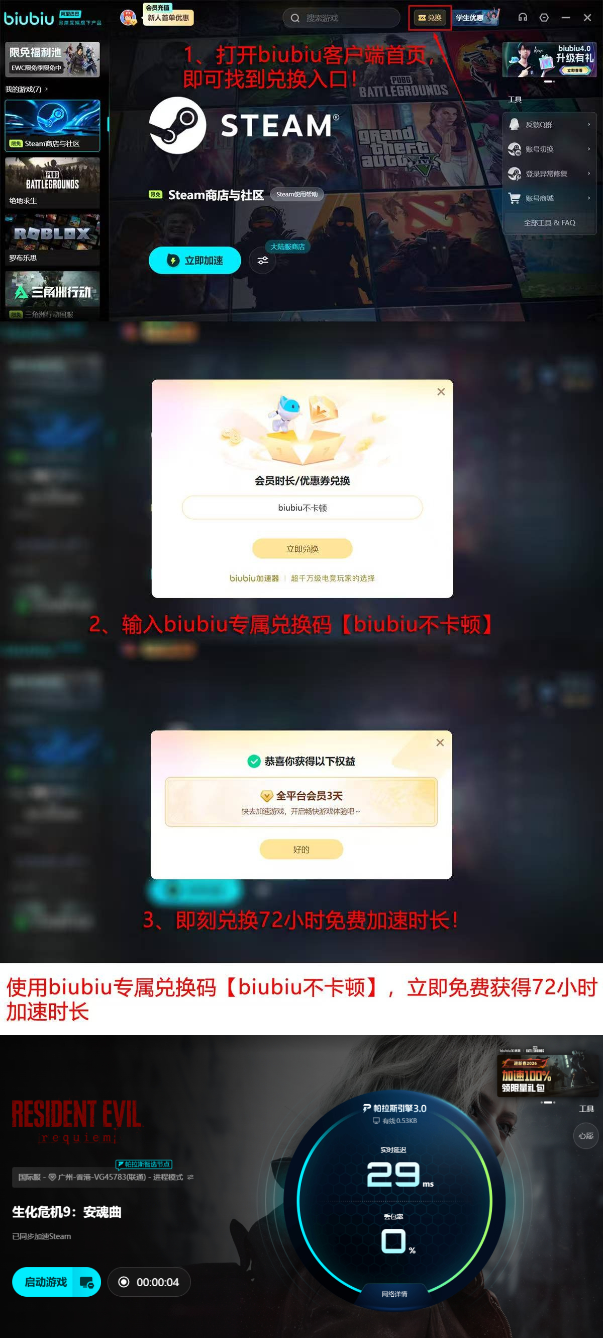 新用户注册biubiu加速器即可激活24小时全功能免费试用权限;输入专属口令【biubiu不卡顿】,额外获赠72小时加速时长,总计可享96小时无限制高速连接服务,确保疗养院密室及后续章节全程流畅运行。