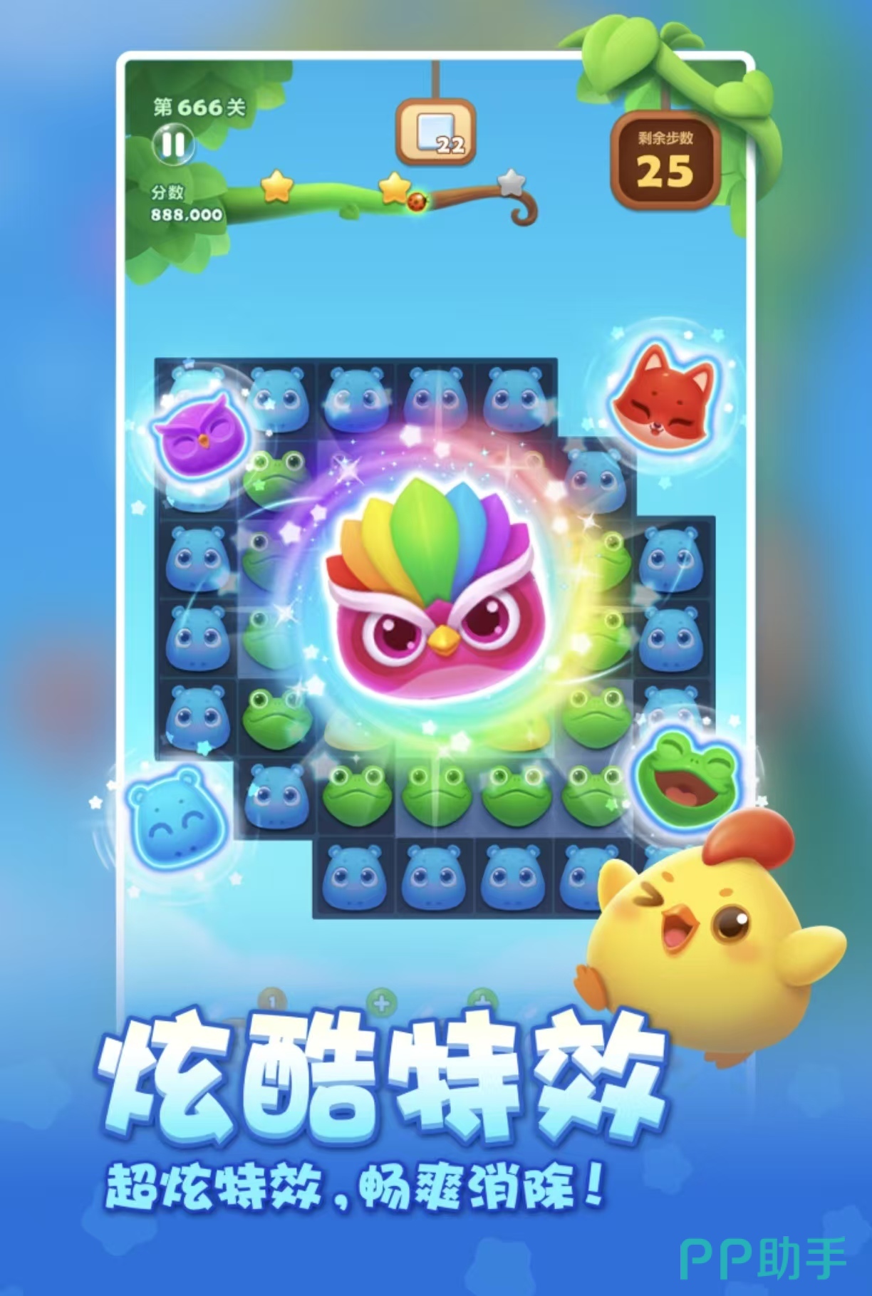 本作以清新明快的卡通美术风格著称,场景构建富有童趣与细节表现力,每关均设有独特视觉主题与动态建筑元素。核心玩法围绕点击匹配相同图标展开,达成指定目标即可通关。系统内置多种功能型道具,如爆炸特效、直线清除等,配合不断进化的障碍物(冰块、藤蔓、锁链)及步数限制机制,对玩家规划能力提出更高要求。整体画面饱和度高,节奏轻快,适合全年龄段用户。
