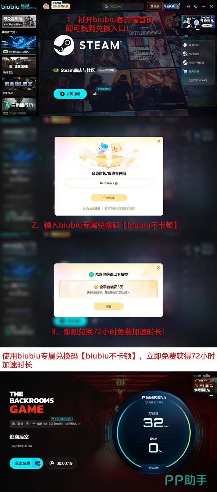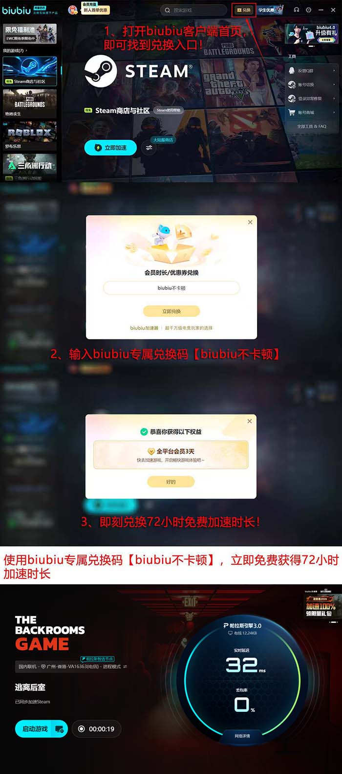 对于追求流畅解谜体验的《逃离后室》玩家而言,网络稳定性是基础保障。新用户可免费试用4天,注册成为biubiu会员后系统自动发放24小时加速时长;进入首页点击“兑换”,输入口令【biubiu不卡顿】,即可额外领取72小时,总计享96小时无限制加速服务。