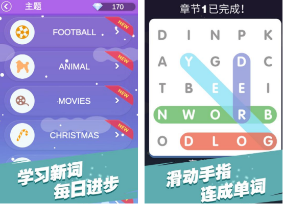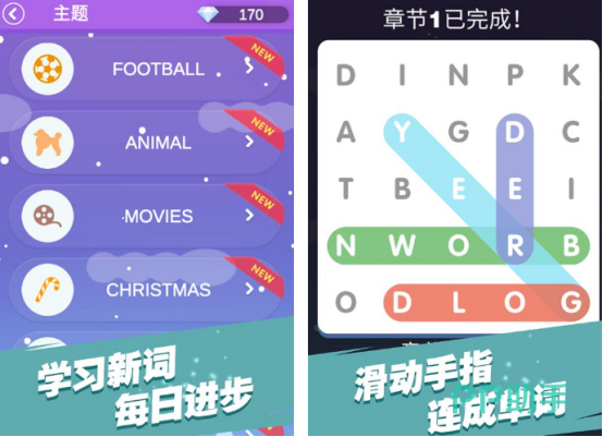 这是一款轻量级拼字解谜游戏,上手门槛低,30秒内即可掌握核心玩法。依托庞大且分级的词库系统,玩家通过滑动字母块组合成有效英文单词,成功后自动推进至下一挑战章节。内置多维度主题任务模块(如动物、颜色、数字等),有效利用通勤、课间等碎片时段,持续拓展基础词汇量。