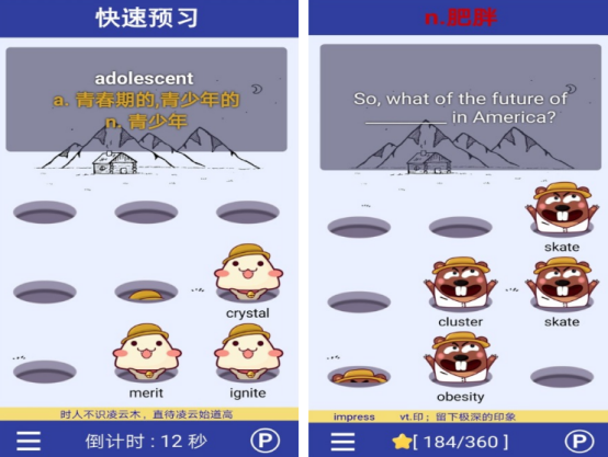 以拟人化小老鼠为主角,构建沉浸式单词探索场景。游戏中出现的各类动物形象均关联标准英文单词,支持拼写回溯、语音跟读与释义提示功能。系统智能标记生词状态,可自主设置“陌生词预习模式”,帮助孩子针对性突破薄弱环节,实现个性化词汇积累路径。