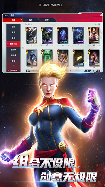 游戏采用TCG+RTS混合机制,卡组构筑上限为30张,含英雄卡、技能卡、装备卡三类。内战模式还原索科维亚协议冲突,英雄羁绊系统支持复仇者联盟、神盾局、银河护卫队等六大阵营自由混搭。战斗阶段启用实时战场缩略图,玩家可拖拽调整英雄站位,触发“交叉火力”“掩体压制”等战术判定。