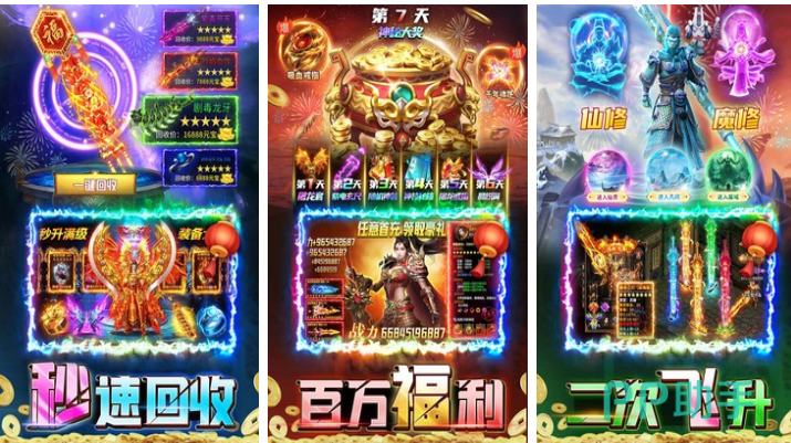 强调经济系统深度交互,支持装备回收折现、跨服摆摊与价格浮动监控。飞升系统打破等级上限桎梏,解锁独立技能分支与外观幻化模块。每日签到奖励包含金币、祝福油、传送卷轴等实用道具,连续领取满七日可激活额外成长礼包。