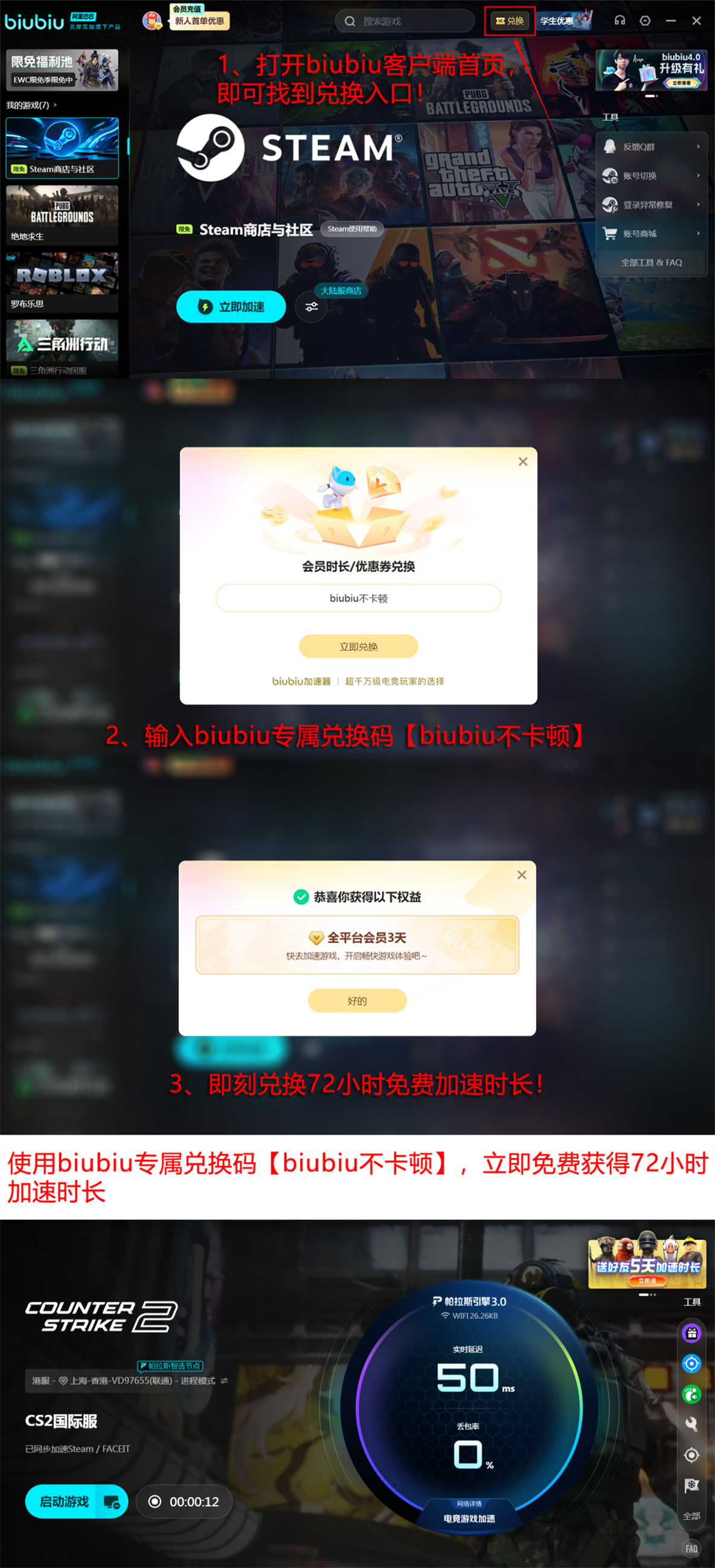 biubiu采用会员制服务模式。新用户注册后可立即获得24小时免费加速时长;此外,所有账号均享有一次使用兑换码【biubiu不卡顿】领取72小时加速权益的机会,总计体验时长达96小时。验证效果后再开通正式会员,还可叠加首充特惠及学生身份认证折扣。