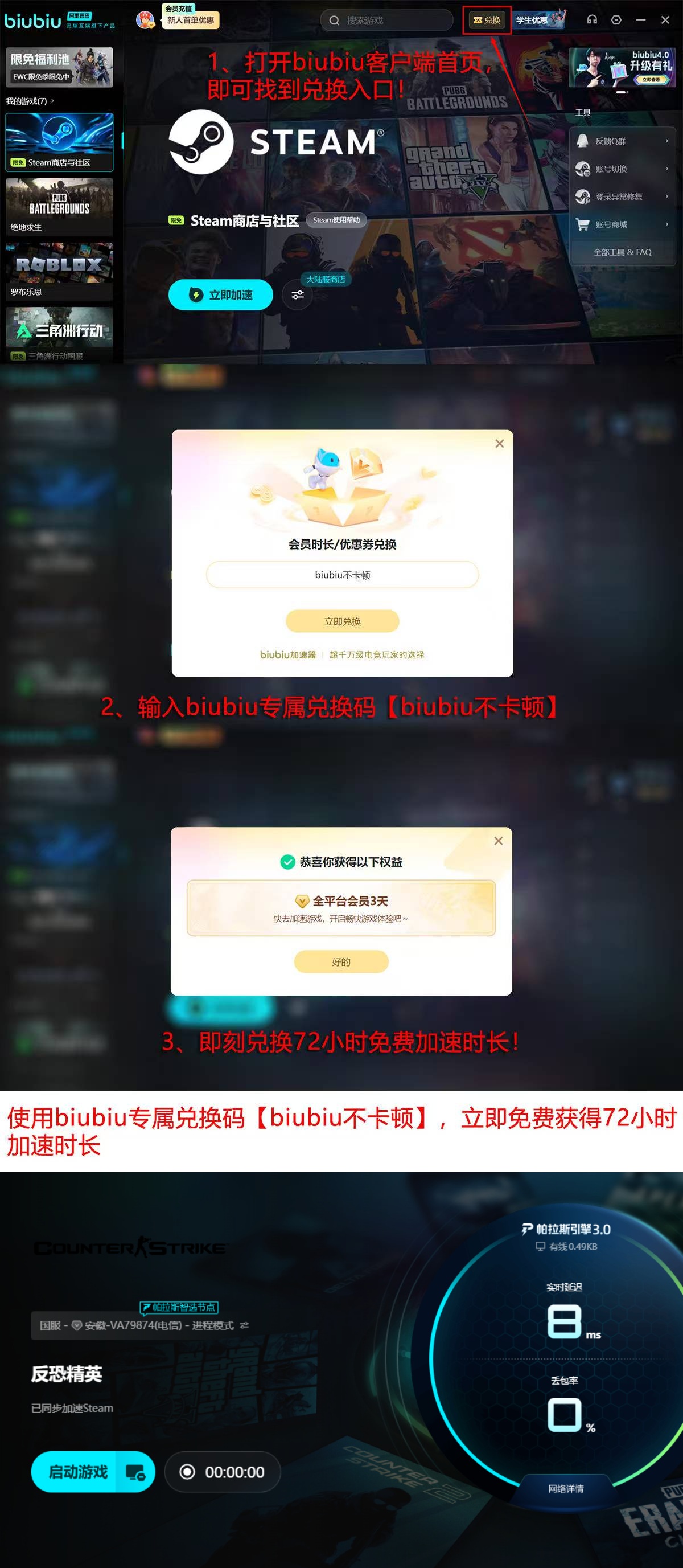 目前平台面向新用户提供双重福利支持:注册并完成首次登录后,系统将自动发放24小时免费加速时长;所有用户均可通过首页“兑换中心”入口,首次输入激活码【biubiu不卡顿】,额外领取72小时免费加速时长。两项权益可叠加使用,新用户总计可获得96小时免费加速服务。