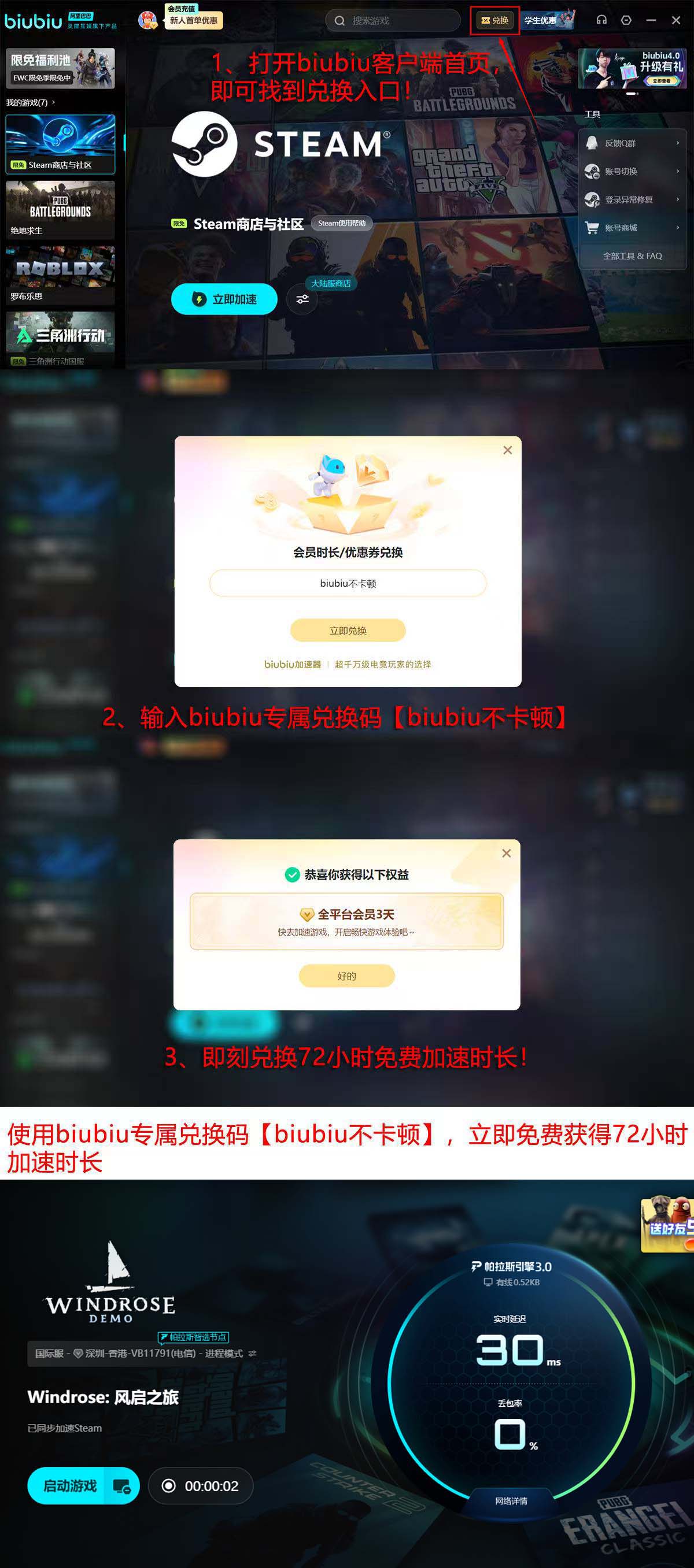 为帮助新玩家快速建立稳定联机环境,biubiu加速器现开放限时体验通道:完成注册后,账户自动获赠24小时加速时长;随后进入首页“兑换”入口,输入专属口令【biubiu不卡顿】,即可额外领取72小时,累计达96小时免费使用权限。