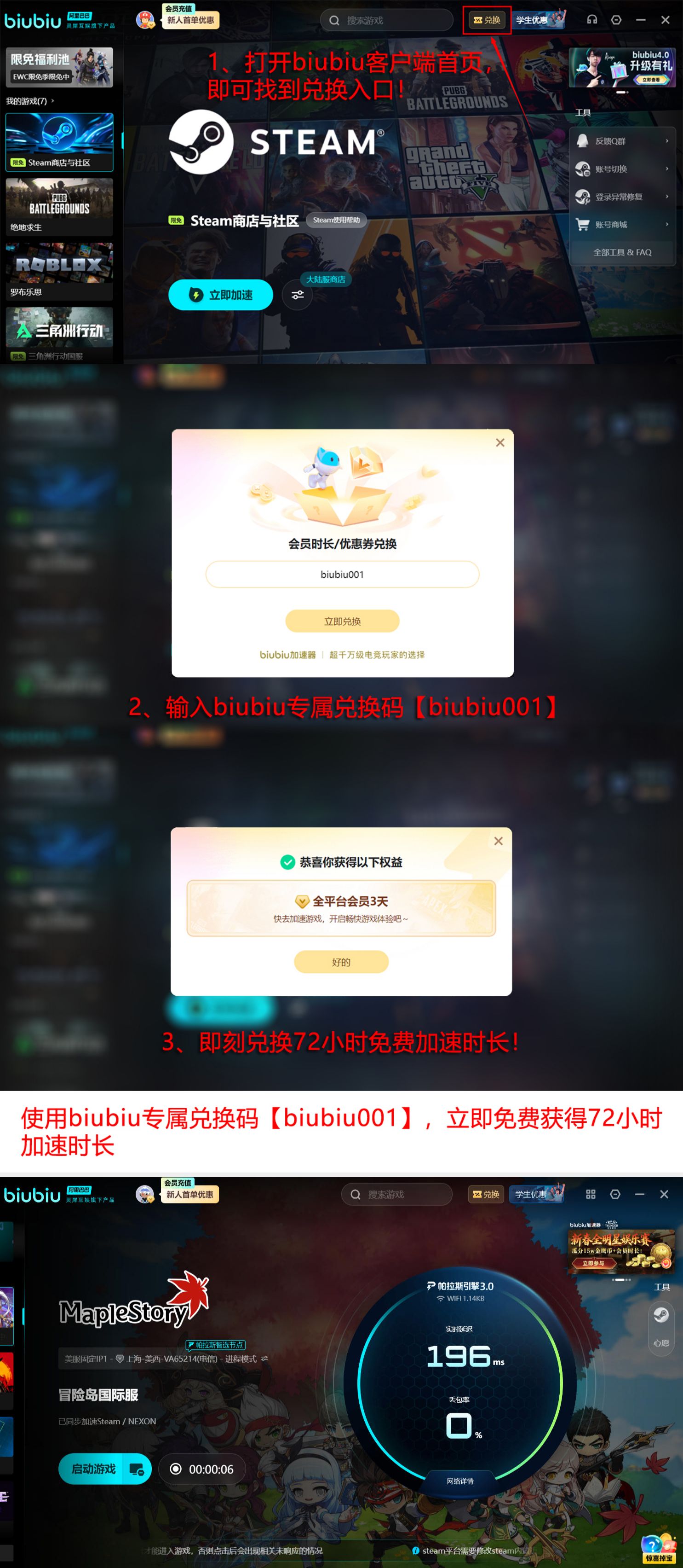 新用户完成注册及实名认证后,即可立即领取24小时免费加速时长;福利期结束后,所有用户均可使用兑换码【biubiu001】兑换72小时额外加速权益。新用户最高可累计享有96小时免费体验时长,轻松应对冒险岛国际服更新、登录、联机等全场景网络需求。