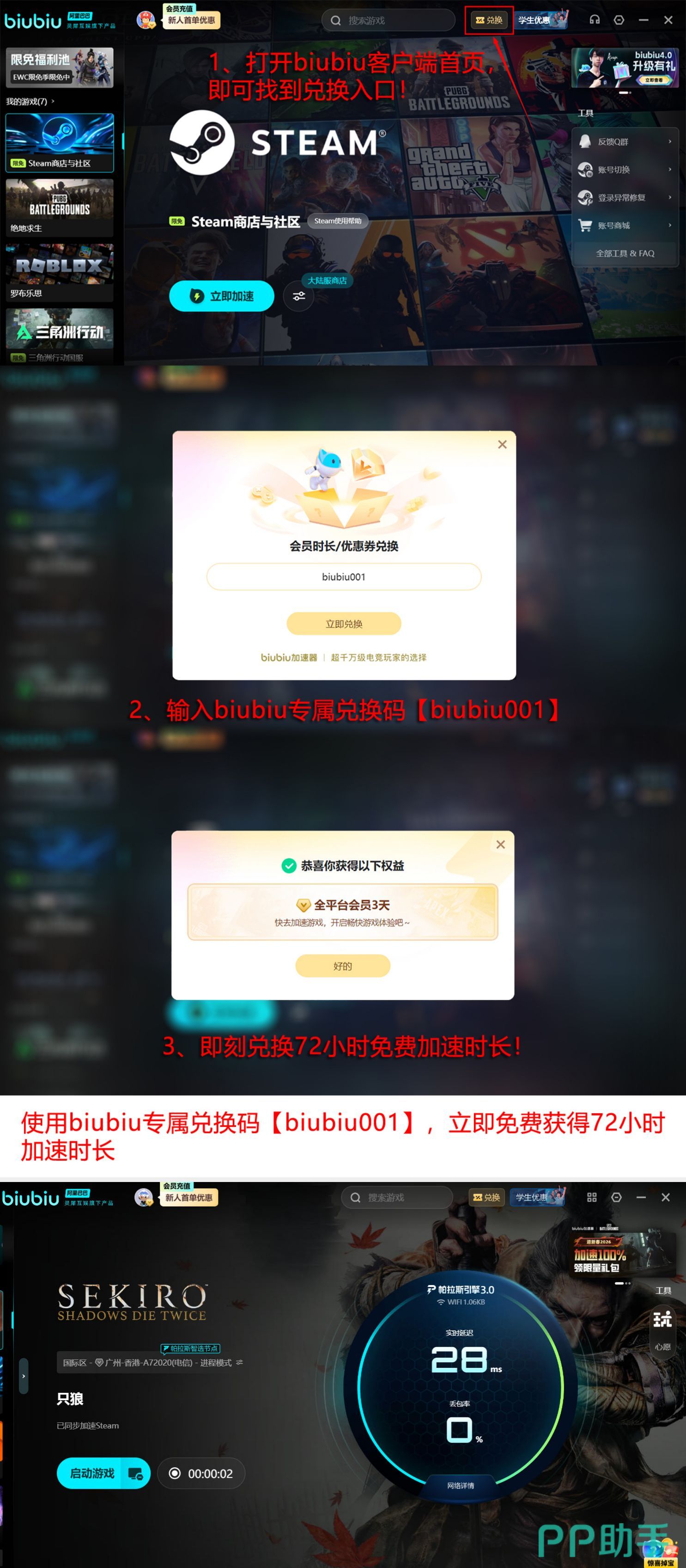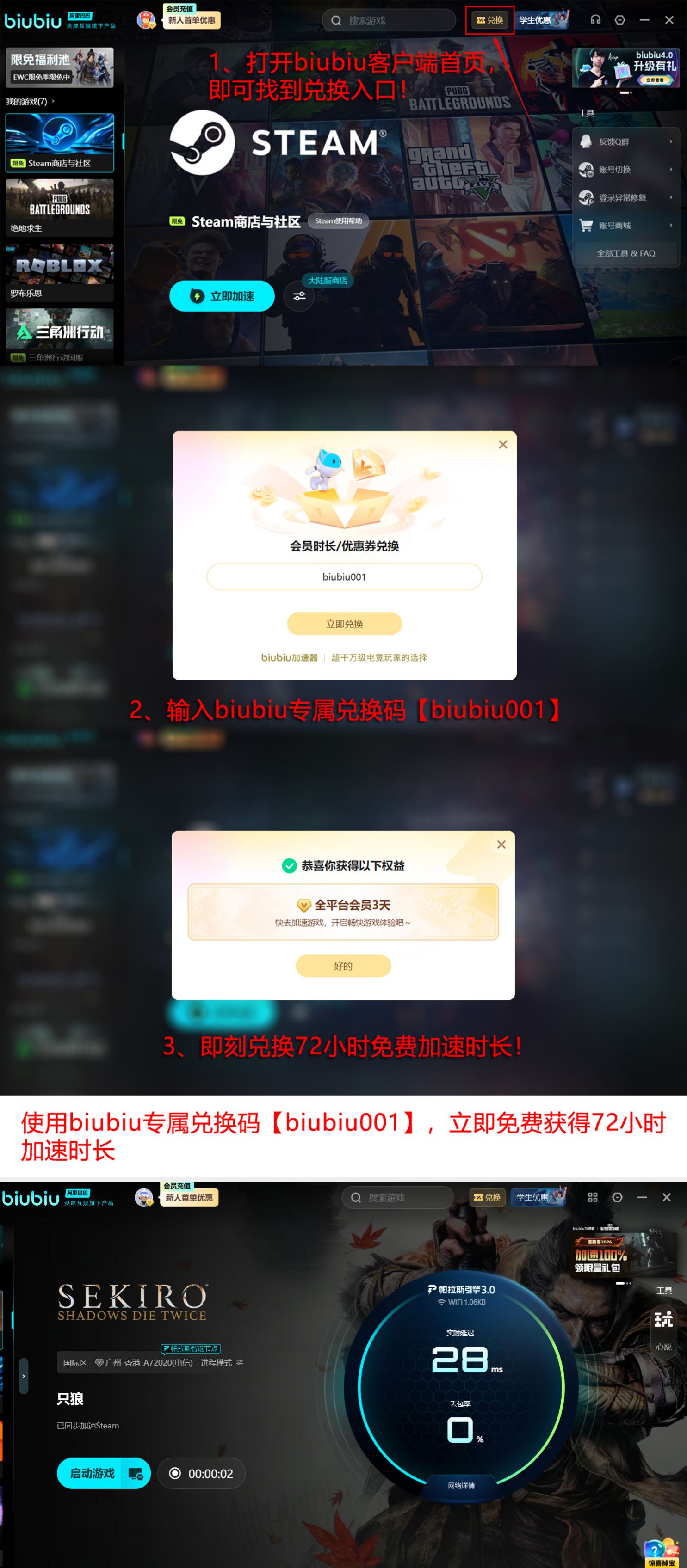 当前新用户可享多重免费权益:输入通用激活码【biubiu001】,立即领取3天全节点加速时长;完成首次注册并登录后,额外解锁24小时基础加速权限。两项福利可叠加使用,总计可获得96小时无限制加速体验,充分覆盖游戏全流程内容验证周期。