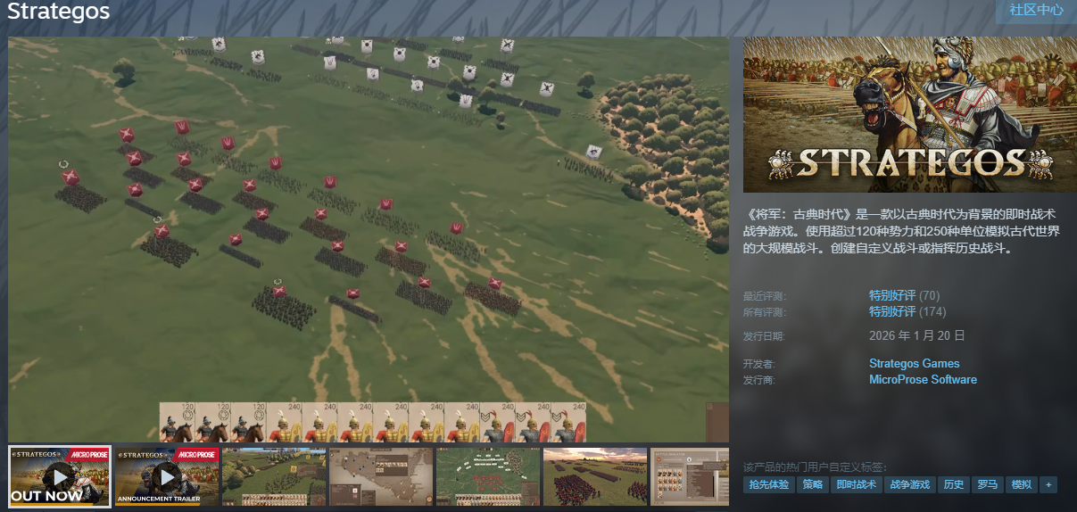 Strategos已于1月20日正式登陆Steam平台,开启全球发售。这款以古典战争为背景的即时战术游戏,深度还原公元前8世纪至公元3世纪的欧亚大陆战场,涵盖希腊城邦、罗马共和国、波斯阿契美尼德王朝等十余个历史文明体系。玩家可操控超过120种独立势力,体验马其顿方阵、波斯不死军、罗马军团、迦太基战象部队等250余种特色兵种,战术维度丰富,战场逻辑严谨,被众多历史策略爱好者誉为“古典军事模拟的标杆之作”。