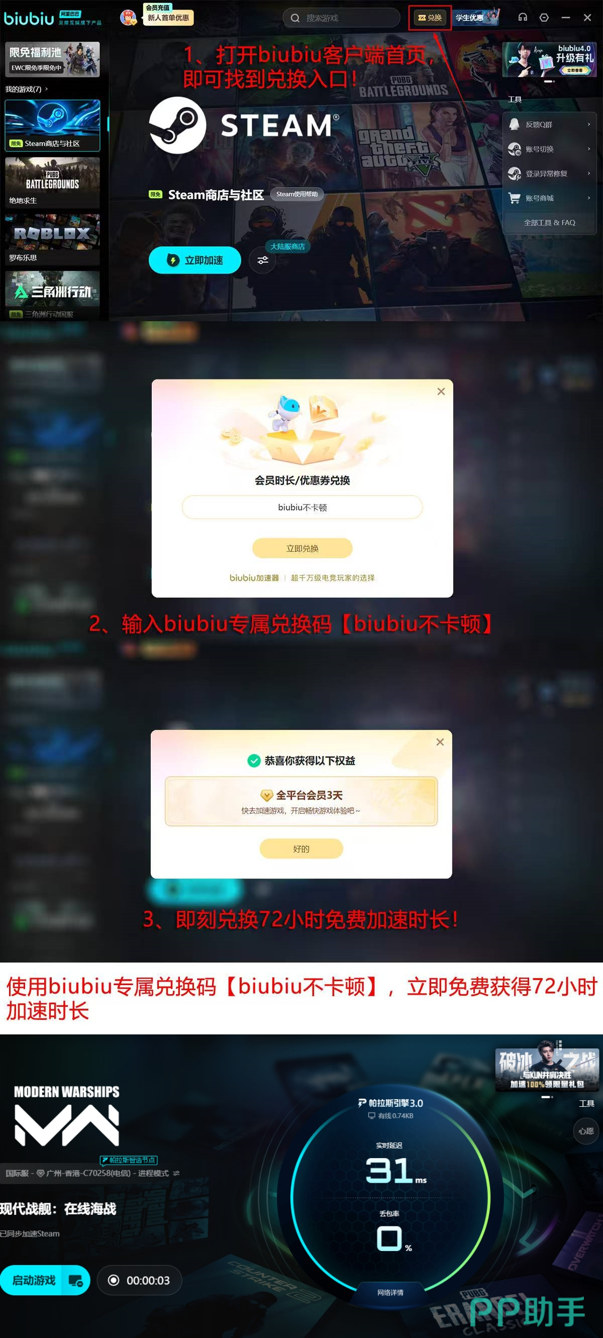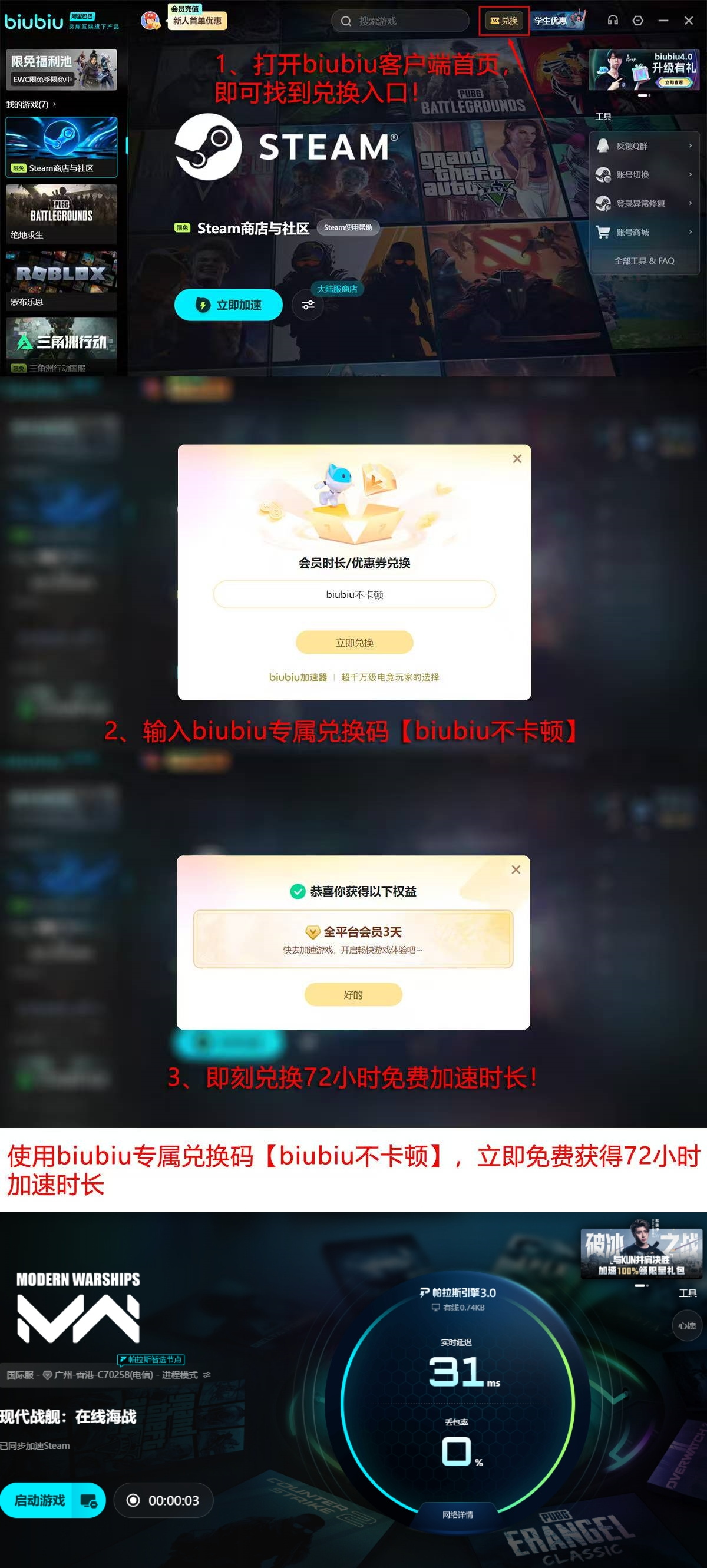 当前版本还同步上线多项用户激励计划:输入【biubiu兑换码】可即时兑换72小时全功能使用权;新注册用户额外享24小时专属加速时长,累计达96小时免费体验期。该福利周期与使用权限为当前市场同类产品中覆盖时长最长、门槛最低的组合方案。此外,平台已预置超2000款主流游戏的专属加速配置,涵盖PC端、主机模拟器及移动端热门作品,确保《严阵以待》及其他战术类、竞技类、MMO类游戏均可获得针对性网络优化。