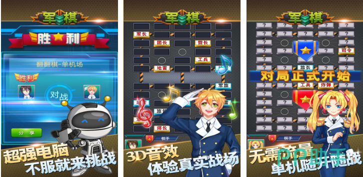 支持单人闯关与实时联网对战双模式,采用3D环绕音效增强战场沉浸感;无需持续联网即可进行本地公平对弈;卡通化界面风格清晰明快,内置多种玩法分支,包括经典暗棋、明棋及挑战模式;对局节奏紧凑,军衔系统完整还原真实军事职级体系,便于新手理解规则逻辑。