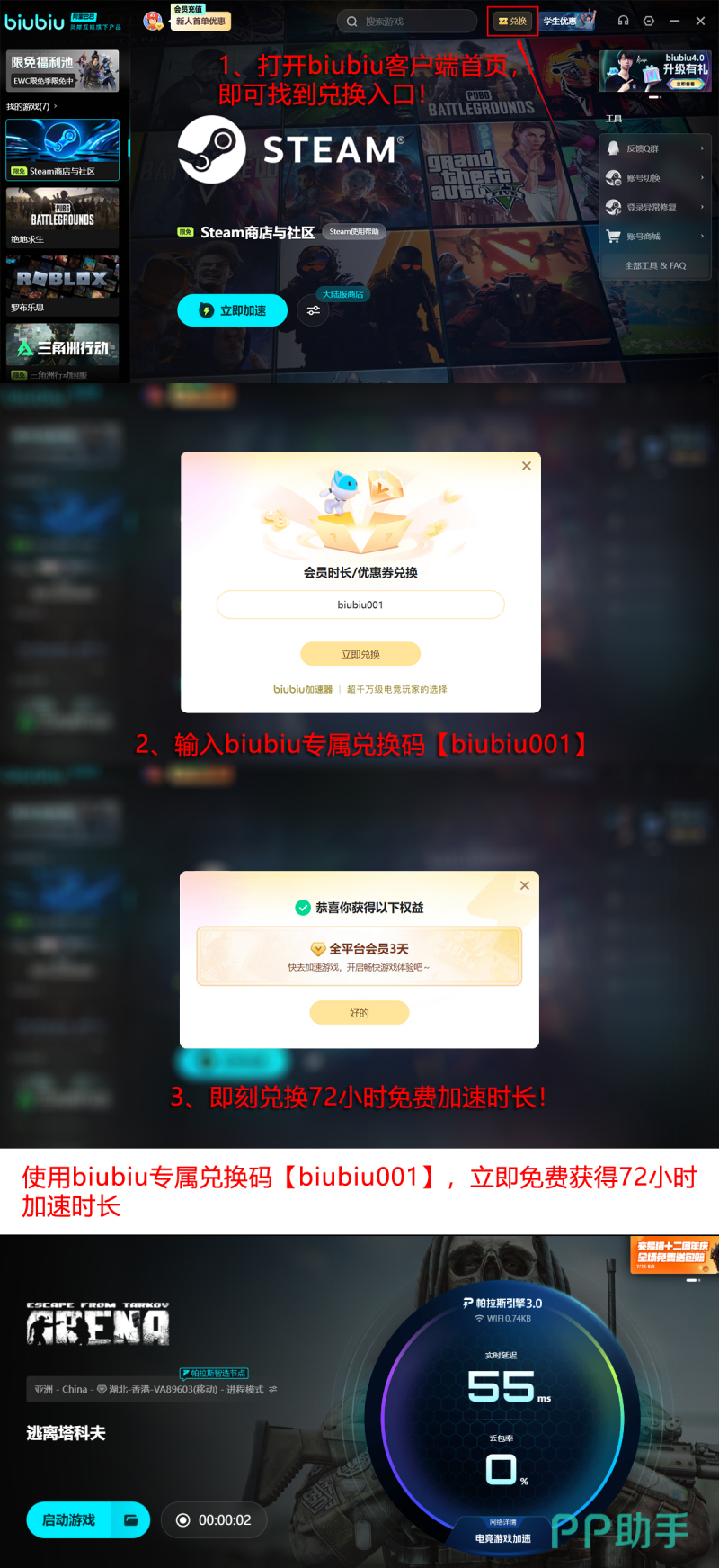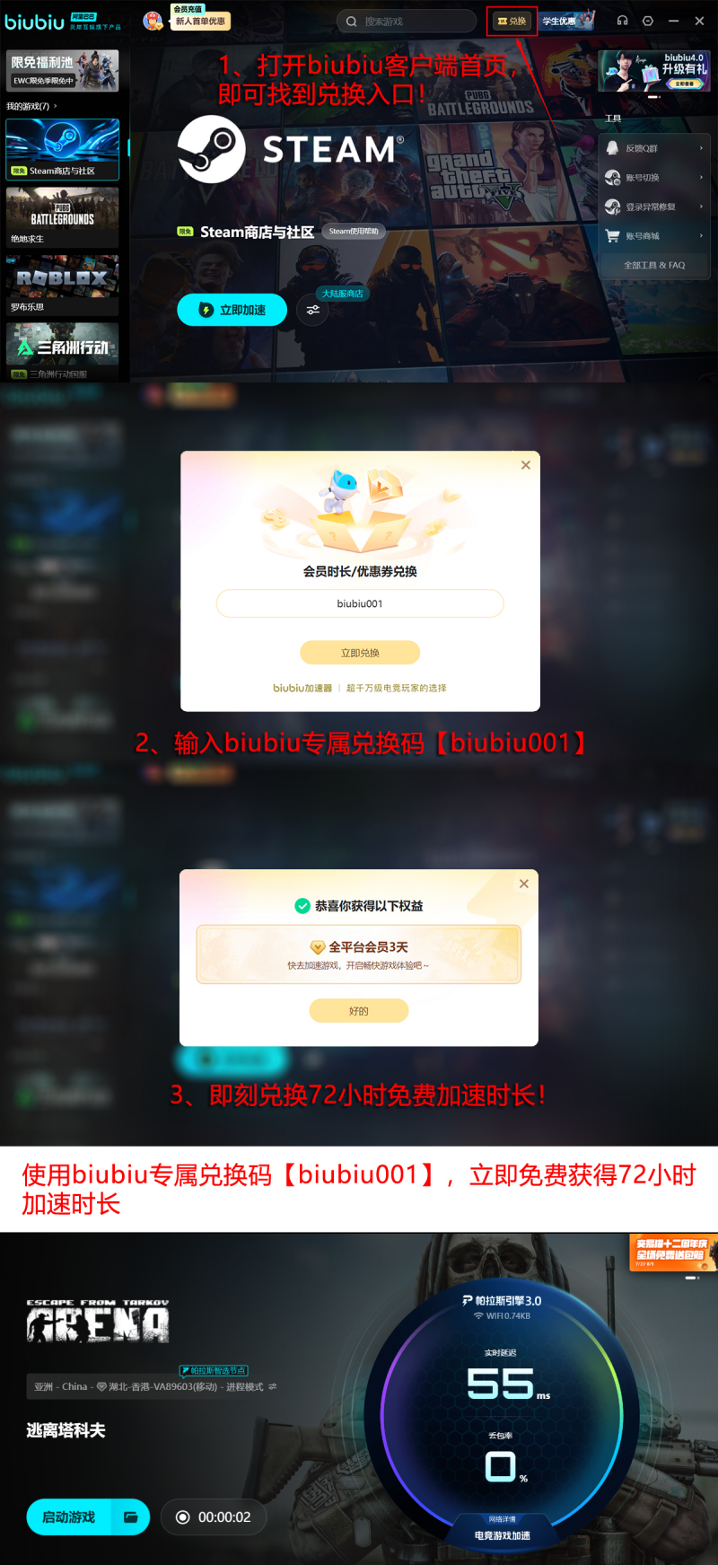 为降低玩家体验门槛,biubiu加速器持续提供零门槛试用权益。所有用户输入通用兑换码【biubiu001】即可领取3天免费加速时长;新用户完成首次注册后,还可额外获赠24小时专属加速权限。两项福利叠加,总计可享96小时无限制加速服务,充分覆盖多局高强度对战需求,切实保障开镜顺滑、瞄准跟手、操作反馈即时的游戏体验。