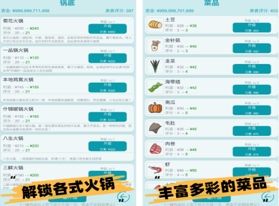 文字驱动型模拟经营游戏,侧重知识性与策略性。玩家从零起步打造专属火锅品牌,逐步解锁川渝麻辣系、京派铜锅系、潮汕牛肉系等主流火锅流派,对应配置锅底、蘸料与特色配菜。随着进度推进,还可拓展饮品菜单,构建完整餐饮服务体系。