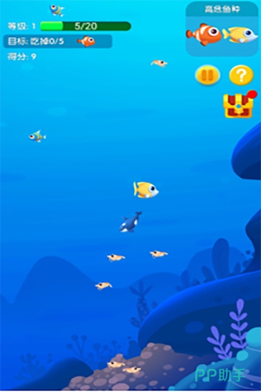 采用扁平化插画风格,界面呼吸感强,适配高强度工作后的压力释放。核心规则极度纯粹:仅需控制角色碰撞比自身体积小的目标即可完成吞噬,体积增长实时可见。收录超过60种真实鱼类,每种具备专属被动效果——如䲟鱼吸附加速、翻车鱼群体护盾、海马隐身突袭等。无体力值限制、无付费陷阱,纯靠策略搭配应对不同关卡地形与鱼群构成。