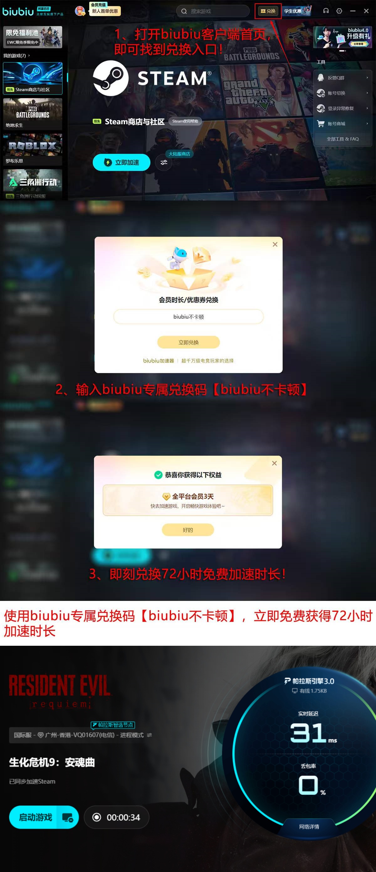 当前新用户注册即赠24小时全功能免费加速时长;所有用户均可凭口令【biubiu不卡顿】额外领取72小时加速权益。两项福利支持叠加使用,新用户最高可享96小时无限制体验。BSAA钥匙的获取逻辑清晰、路径唯一,严格遵循主线节奏,按步骤执行即可顺利取得,为后续集装箱解密与剧情深入提供必要条件。