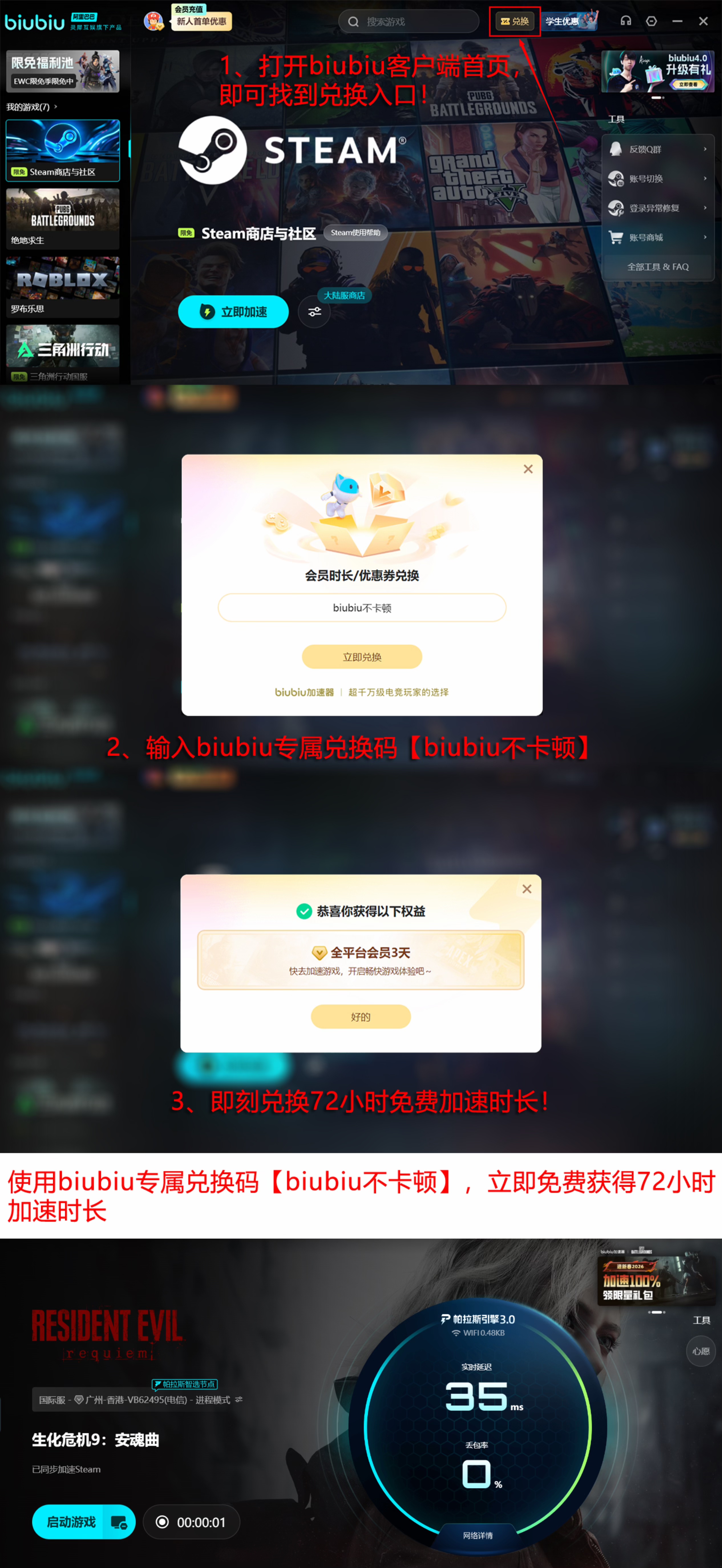 新用户注册后可直接获得24小时全时段免费加速权益;已注册用户输入口令【biubiu不卡顿】,即可激活连续3天的无限制加速服务。该福利覆盖游戏全流程,包括启动加载、在线联机及CG播放环节。