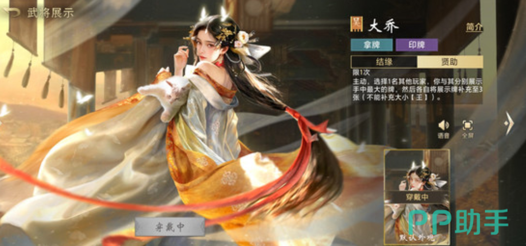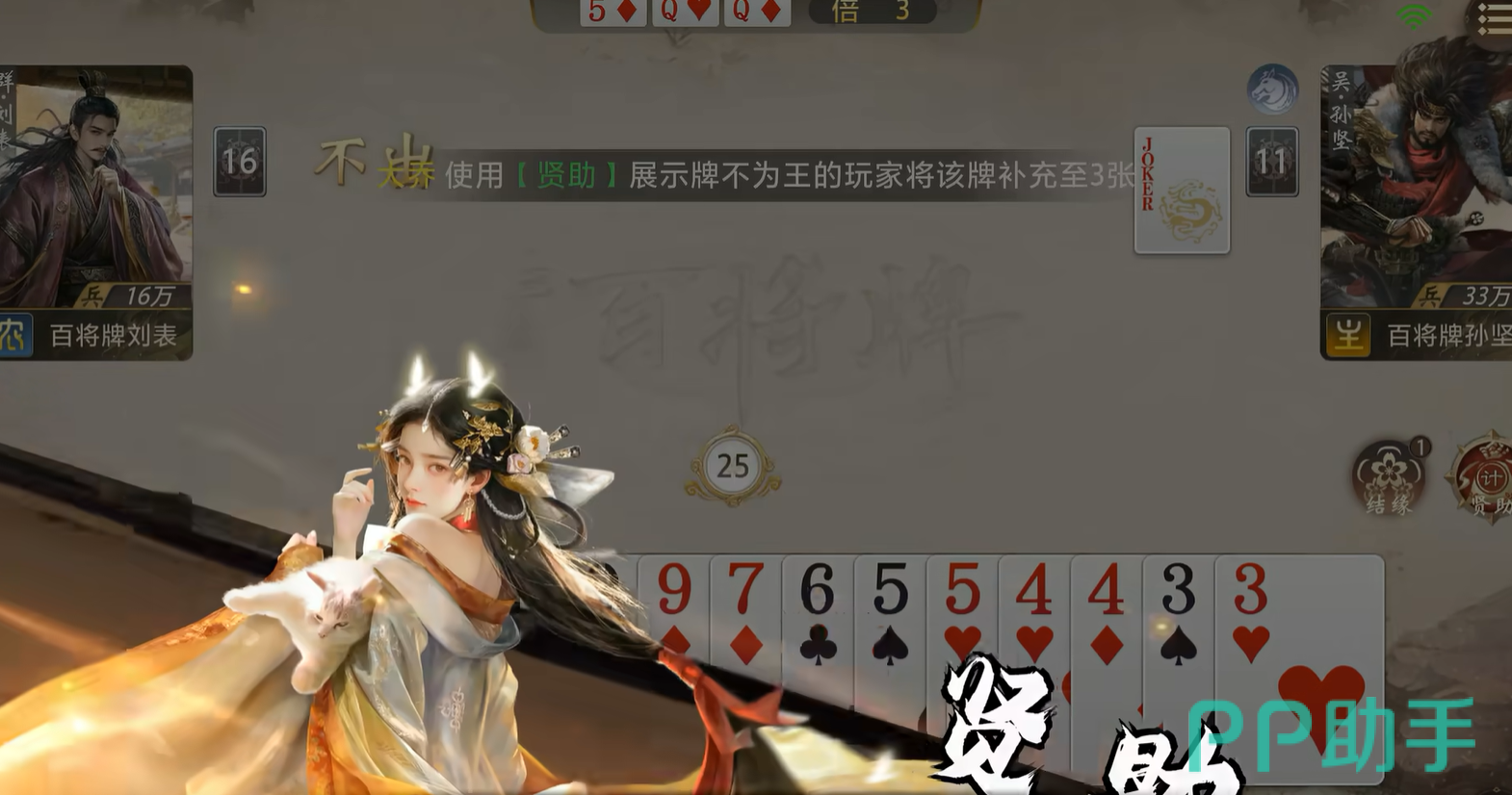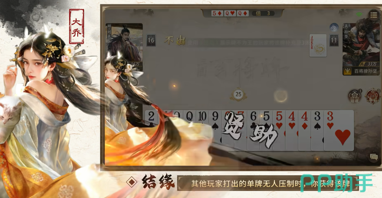 大乔拥有两项关键技能:【结缘】与【贤助】。【结缘】可在对手打出未被压制的单张牌时触发,自动回收该牌,实现低风险资源积累,为后续构建高权重组合(如2、A、炸弹)奠定基础;【贤助】则允许她主动选择一名玩家进行手牌比对,若己方手牌点数小于对方,则从对方手牌中选取三张加入自身牌堆——该效果既可强化自身出牌结构,亦可定向支援队友补足关键牌型。实战中,大乔常以小牌试探逼迫对手暴露底牌,再通过精准补牌掌控回合节奏,体现“以智代力、以静制动”的战术哲学。