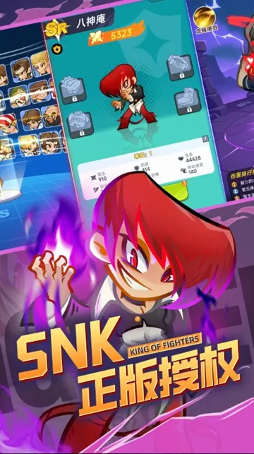 本作以《拳皇》系列为创作蓝本,高度还原八神庵、大蛇、不知火舞等标志性角色形象,并在美术风格上进行统一萌系化重塑——既保留人物辨识度与动作特征,又赋予其更富亲和力的视觉表现。每位角色均完整复刻其招牌必杀技,如八神庵的“葵花三连”、不知火舞的“必杀·花蝶扇”,技能演出精准还原街机时代的节奏感与打击反馈。
