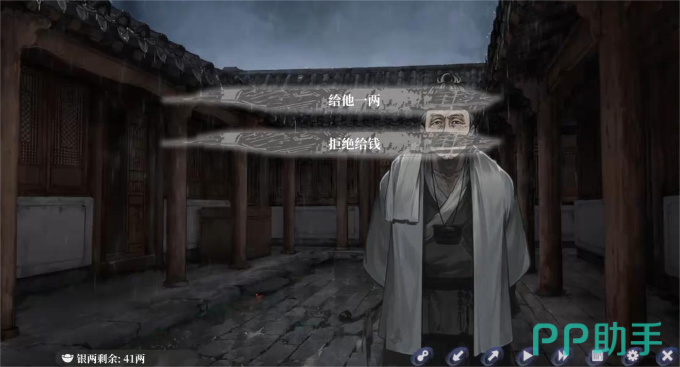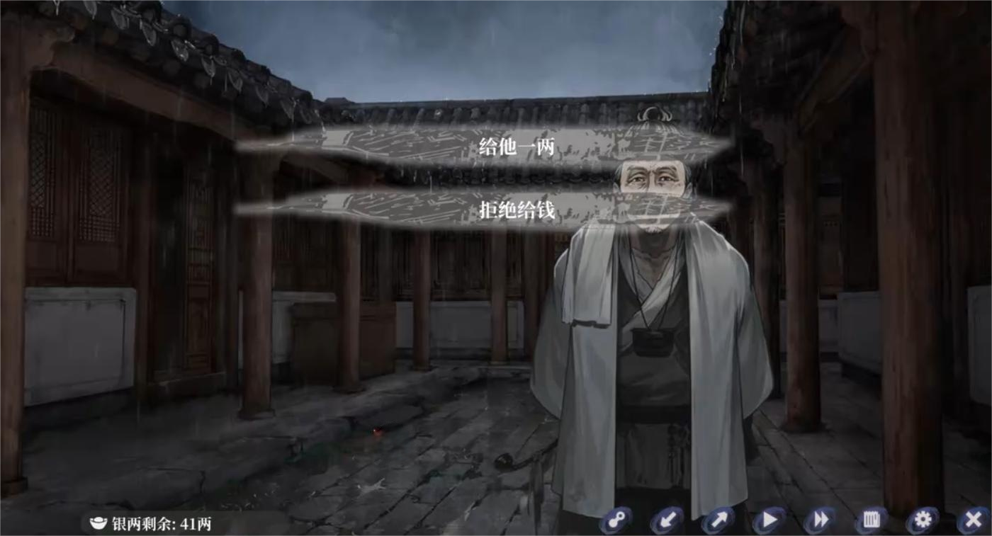 银子是贯穿全篇的核心流通资源。它不仅用于向城中各色人物支付通行费、赎金、情报费,也直接影响角色生存状态:部分NPC会因索要未果而触发敌对事件;也有流民、老医者、逃兵等角色会在你主动赠予银两后,以不同方式反馈善意——或是提供隐藏线索,或是暂缓追捕时限,甚至解锁临时庇护所。这种动态资源交互构成了游戏底层行为逻辑的重要一环。