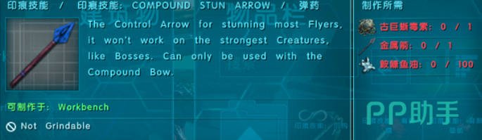 蓝色眩晕箭也被玩家们称之为电箭,在驯服过程当中可以说是必备法宝,但仅限于飞行龙,在一些大体型的用处并不是很大,玩家需要收集古巨蜥毒素、金属箭、安康鱼油,就可以制作出来。