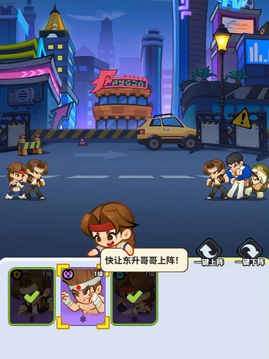 游戏采用策略卡牌对战机制,角色定位与技能协同是核心玩法。东丈在阵容中主要承担副输出(副C)职能,其技能设计高度还原《拳皇》原作中的拳击连段与突进特性。推荐搭配特瑞、安迪组成“饿狼队”,可激活专属羁绊效果——提供全队减伤增益,并提升普攻连击频率;若卡池资源有限,亦可灵活适配大神、不知火舞等高适配性角色,构建稳定输出循环。