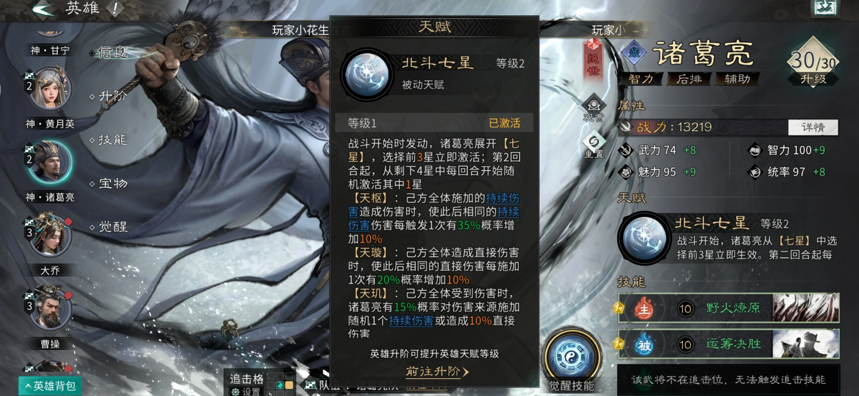 诸葛亮这一身本领,最核心的地方就在于,叫“北斗七星”的天赋。这个设定让他的战斗节奏变得特别有意思。打架刚开始的时候,可以自己选一颗星辰先点亮,这样开局就能给队伍带个好头,拿到第一波增益。接着剩下的星辰会随机亮起来,这就让每场战斗都充满了变数,对手很难猜透你的套路。你看那天枢和天璇两颗星,专门负责提升伤害,一个是让对面持续掉血,一个是直接打出爆发。这两个效果叠加起来,伤害就像滚雪球一样越滚越大。特别是那个持续掉血的效果,触发几率挺高的,有三分之一还要多点,直接伤害也有两成几率,这就保证了诸葛亮在打持久战的时候,一直能给对面造成巨大的压力。