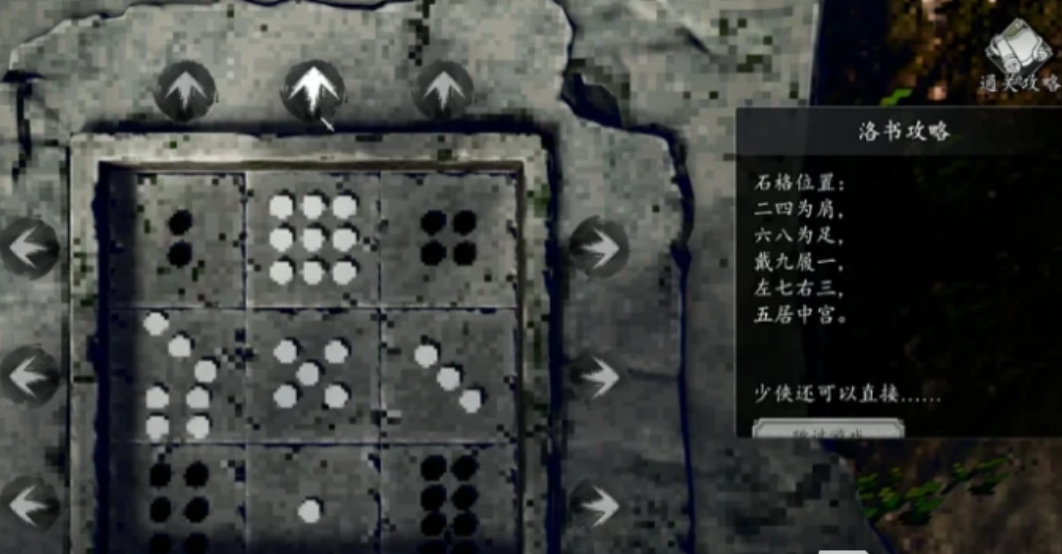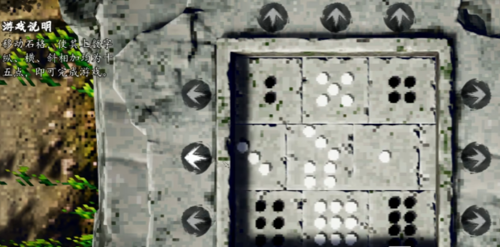 进入第二个机关之后就会碰到经典的石格子排列谜题,即让纵、横、斜三条线上的数字之和都是15。相比之前的方法,这一种更直接,只需要将四个角的位置固定,按“二四为肩、六八为足、五在中间、左七右三、上九下一”的顺序来摆,就可以很容易地完成。虽然它操作起来比较简单,但还是需要一定的逻辑思维,定位到地方之后即可完成,不再受转动圈数或者速度的影响,整体难度下降了很多。