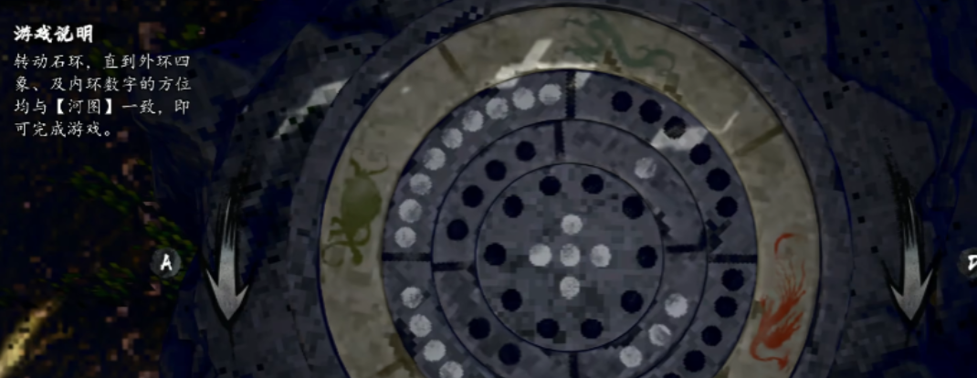碧海仙踪的第一关是一个石环,玩家要调节内外两环的位置,使得内、外圈数字与河图完全一致。四象的位置是固定的上朱雀、下玄武、左青龙、右白虎,内部两环的数字也都有固定的对应关系,黑6与白1在下方,白7与黑2在上方,黑8与白3在左边,白9与黑4在右边。理解了最终目标之后,解谜的关键就是掌握石环的转动关系。外环转动一圈就会带动内环转动三圈,中环转动1.5圈可以影响外环一圈,内环每转一圈就会推动中环0.5圈,这样的联动规律就是机关的主旋律。