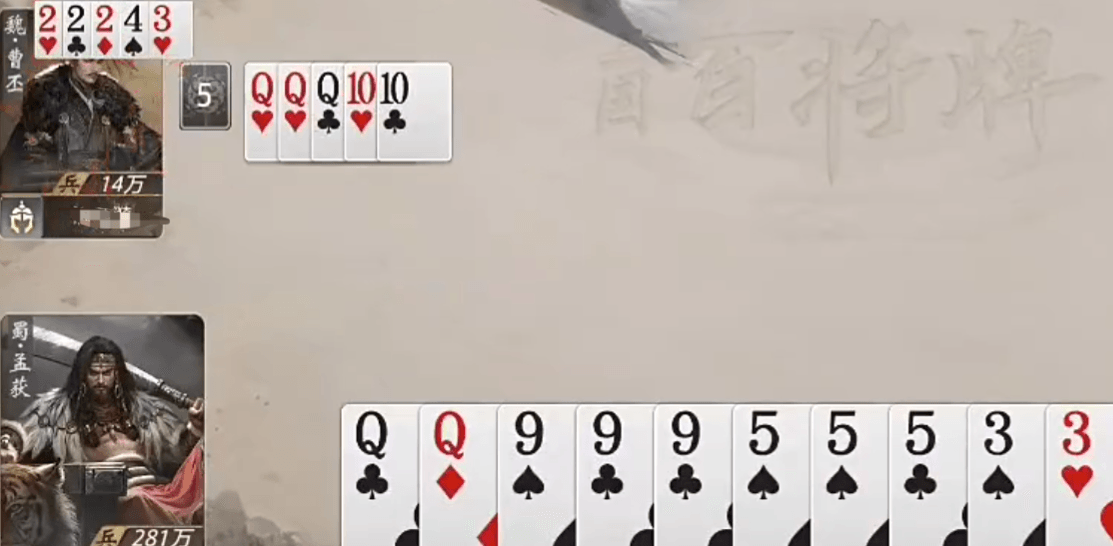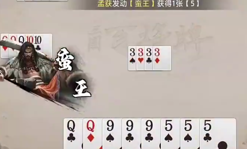 由于复制目标限定为“手中已有牌种”,因此实际产出具备高度实用性:例如持有两张3,则复制结果必为3;若手握三张K,则大概率再次获得K。这种确定性保障显著提升了技能在中后期的稳定性。叠加7次发动上限,使得孟获在连续压制场景下极易构建多组炸弹组合。