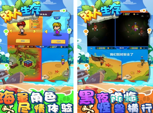 通过两个人在海岛当中求生存为主要类型的游戏,提供海量的角色,可以帮助大家尽情的进行选择,无论是可爱的女生或者是男生角色,都可以利用两个人共同玩游戏的方式进行体验。加入了昼夜交替系统,其中在夜晚降临的时候,就会出现怪兽横行这样危险的局面,所以在晚上的时候更要时刻保持警惕,支持收集资源,制作工具,满足生存的所有需求。