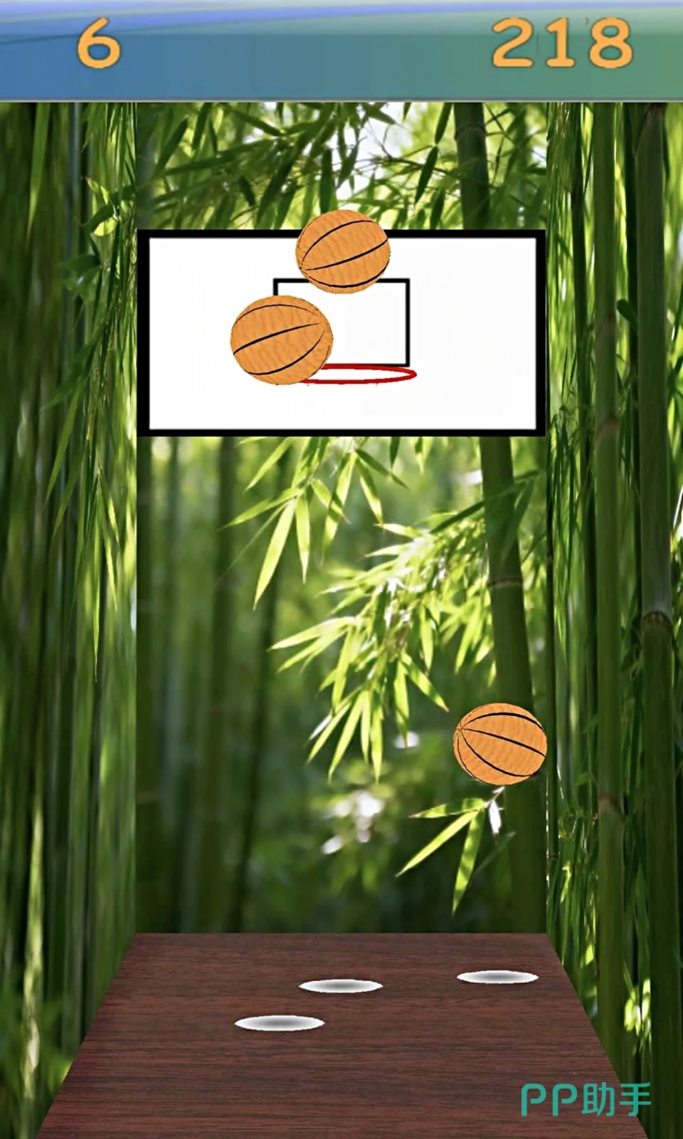 《林间投篮》把投篮场景设定在竹林里面,带给玩家一种清新自然的游戏风采,玩家可以借助这绿色的竹子,运用简单的触屏控制操作体会投篮带来的乐趣,游戏采用物理弹跳的原理,需要玩家精确的掌握投篮的力度和角度,这样才能让篮球精捉的落入摇动的篮筐内,随着游戏进程逐渐的推动,篮筐的位置和竹林的场景也会随之而改变,使玩家体会持续不断的新鲜感挑战。