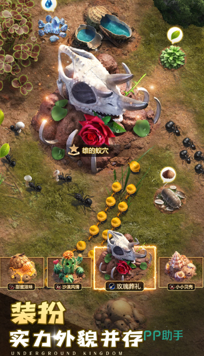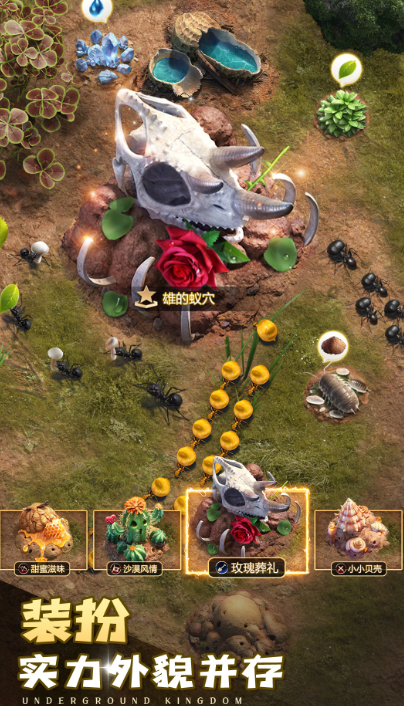 游戏把视角放到了微小的昆虫世界中,玩家要做的是经营一个属于蚂蚁的王国。在游戏里,我们可以慢慢打理属于自己的蚁巢,从简单的洞穴开始,初步搭建出功能齐全的地下空间。除了建设还能带着蚂蚁去探索外面的环境,寻找资源,壮大整个族群的实力,游戏里还会遇到其他不同的生物,需要通过合理的策略与他们对抗,保护自己的家园。